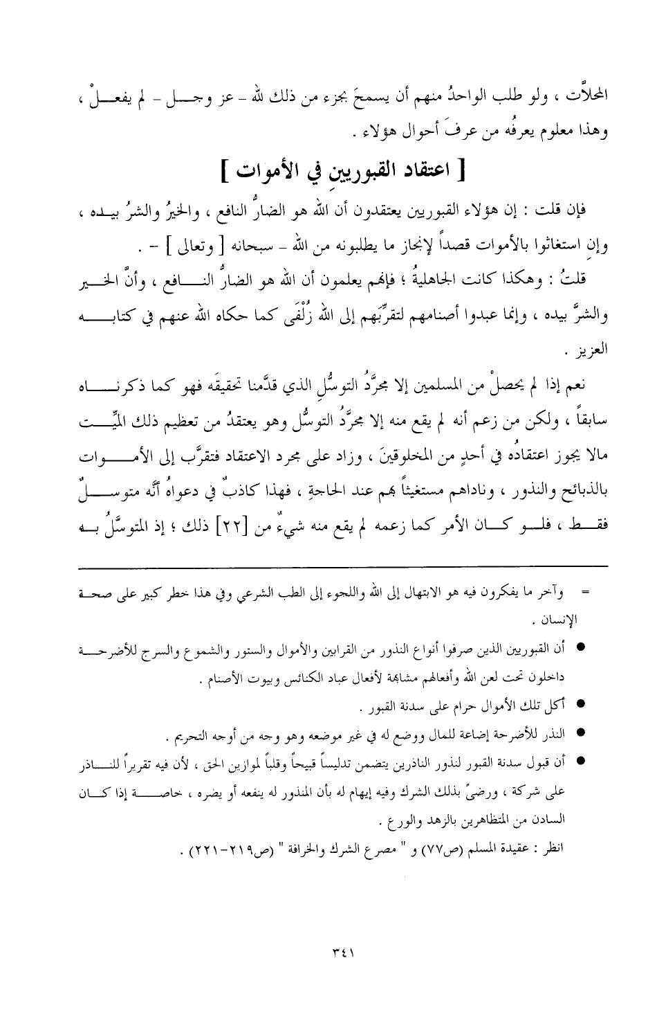 نعم إذا لم يحصل من المسلمين إلا مجرد التوسل الذي قدمنا تحقيقه فهو كما ذكرناه سابقا، ولكن من زعم أنه لم يقع منه إلا مجرد التوسل وهو يعتقد من تعظيم ذلك الميت ما لا يجوز اعتقاده في أحد من المخلوقين، وزاد على مجرد الاعتقاد فتقرب إلى الأموات بالذبائح والنذور، وناداهم مستغيثا بهم عند الحاجة، فهذا كاذب في دعواه أنه متوسل فقط، فلو كان الأمر كما زعمه لم يقع منه شيء من [22] ذلك، إذ المتوسل به