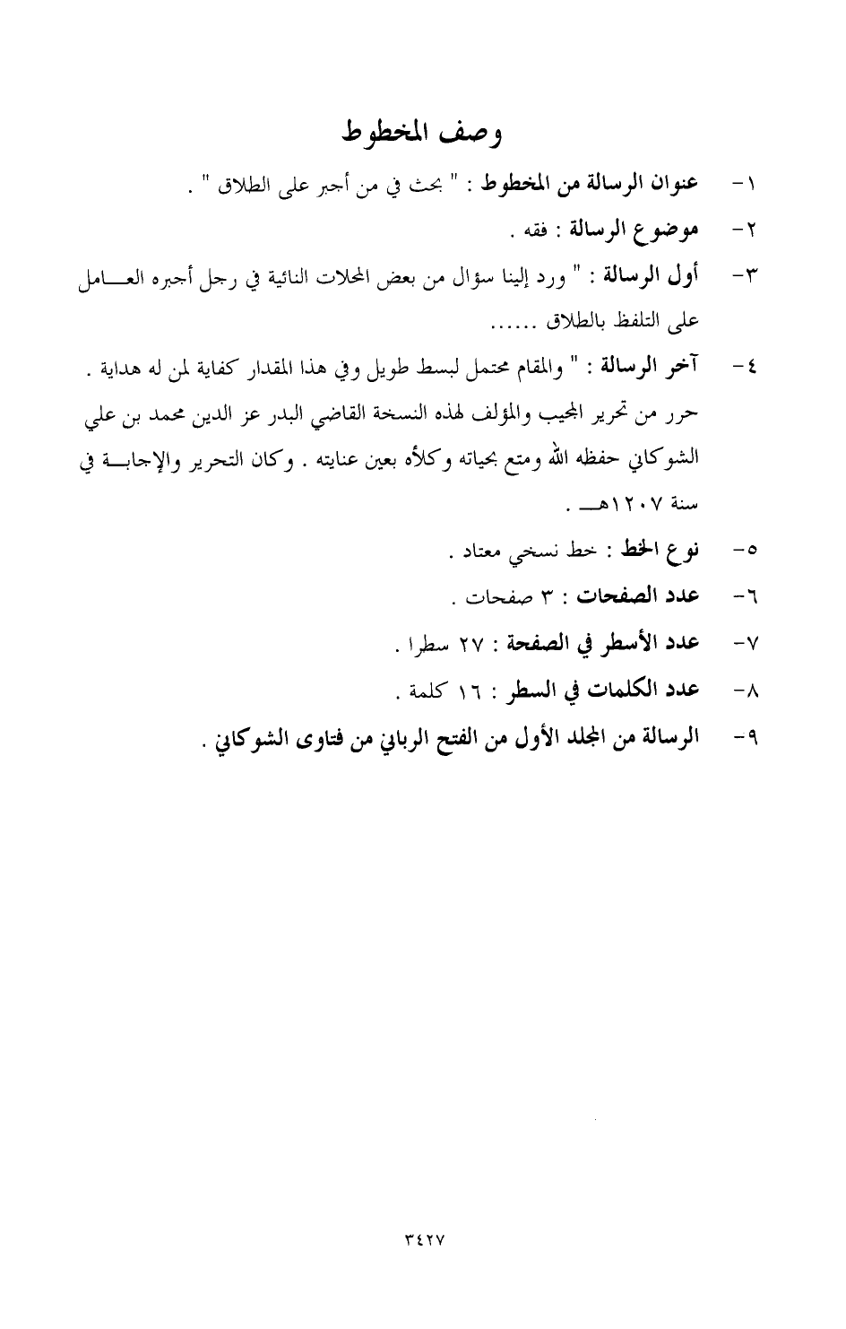 4 - آخر الرسالة: والمقام محتمل لبسط طويل، وفي هذا المقدار كفاية لمن له هداية. حرر من تحرير المجيب والمؤلف لهذه النسخة القاضي البدر عز الدين محمد بن علي الشوكاني، حفظه الله ومتع بحياته، وكلأه بعين عنايته. وكان التحرير والإجابة في سنة 1207 هـ.