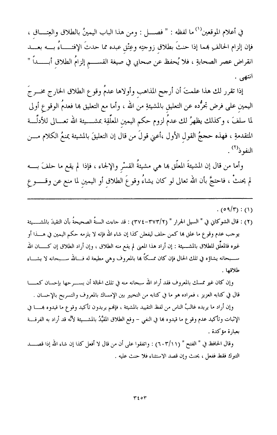 (¬2) قال الشوكاني في " السيل الجرار " (2/ 373 - 374): قد جاءت لسنة الصحيحة بأن التقيد بالمشيئة يوجب عدم وقوع ما علق بها، كمن حلف ليفعلن كذا إن شاء الله، فإنه لا يلزمه حكم اليمين في هذا أو غيره، فالمعلق للطلاق بالمشيئة: إن أراد هذا المعنى لم يقع من الطلاق، وإن أراد الطلاق إن كان الله سبحانه يشاؤه في تلك الحال، فإن كان ممسكا بها بالمعروف وهي مطيعة له فالله سبحانه لا يشاء طلاقها.
