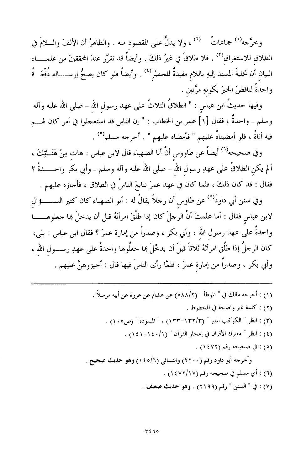 وفيها حديث ابن عباس: " الطلاق الثلاث على عهد رسول الله - صَلَّى اللهُ عَلَيْهِ وَآلِهِ وَسَلَّمَ - واحدة، فقال عمر بن الخطاب: " إن الناس قد استعجلوا في أمر كان لهم فيه أناة، فلو أمضيناه عليهم " فأمضاه عليهم ". أخرجه مسلم (¬5).