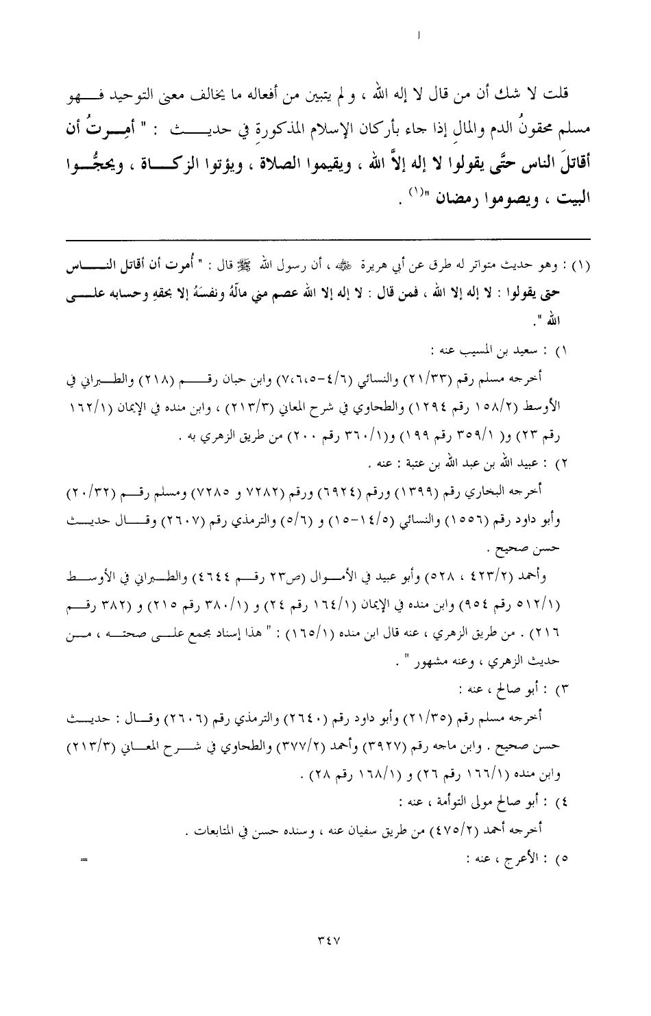 (¬1) وهو حديث متواتر له طرق عن أبي هريرة رضي الله عنه، أن رسول الله صَلَّى اللهُ عَلَيْهِ وَسَلَّمَ قال: "أمرت أن أقاتل الناس حتى يقولوا: لا إله إلا الله، فمن قال: لا إله إلا الله عصم مني ماله ونفسه إلا بحقه وحسابه على الله ".