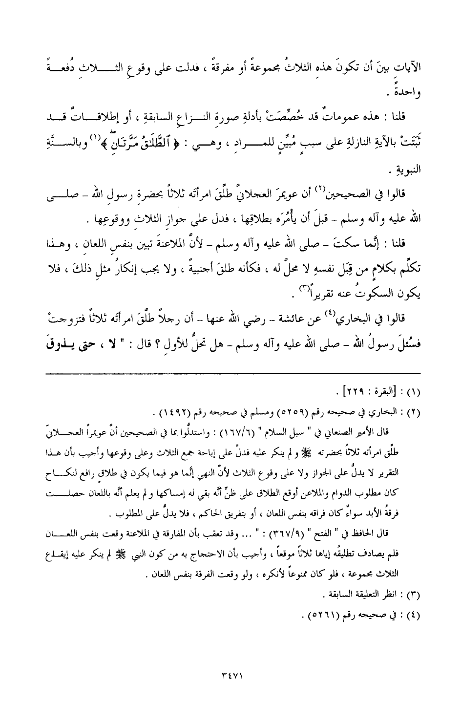 قال الحافظ في " الفتح " (9/ 367): " وقد تعقب بأن المفارقة في الملاعنة وقعت بنفس اللعان فلم يصادف تلطيقه إياها ثلاثا موقعا، وأجيب بأن الاحتجاج به من كون النبي صَلَّى اللهُ عَلَيْهِ وَسَلَّمَ لم ينكر عليه إيقاع الثلاث مجموعة، فلو كان ممنوعا لأنكره، ولو وقعت الفرقة بنفس اللعان.