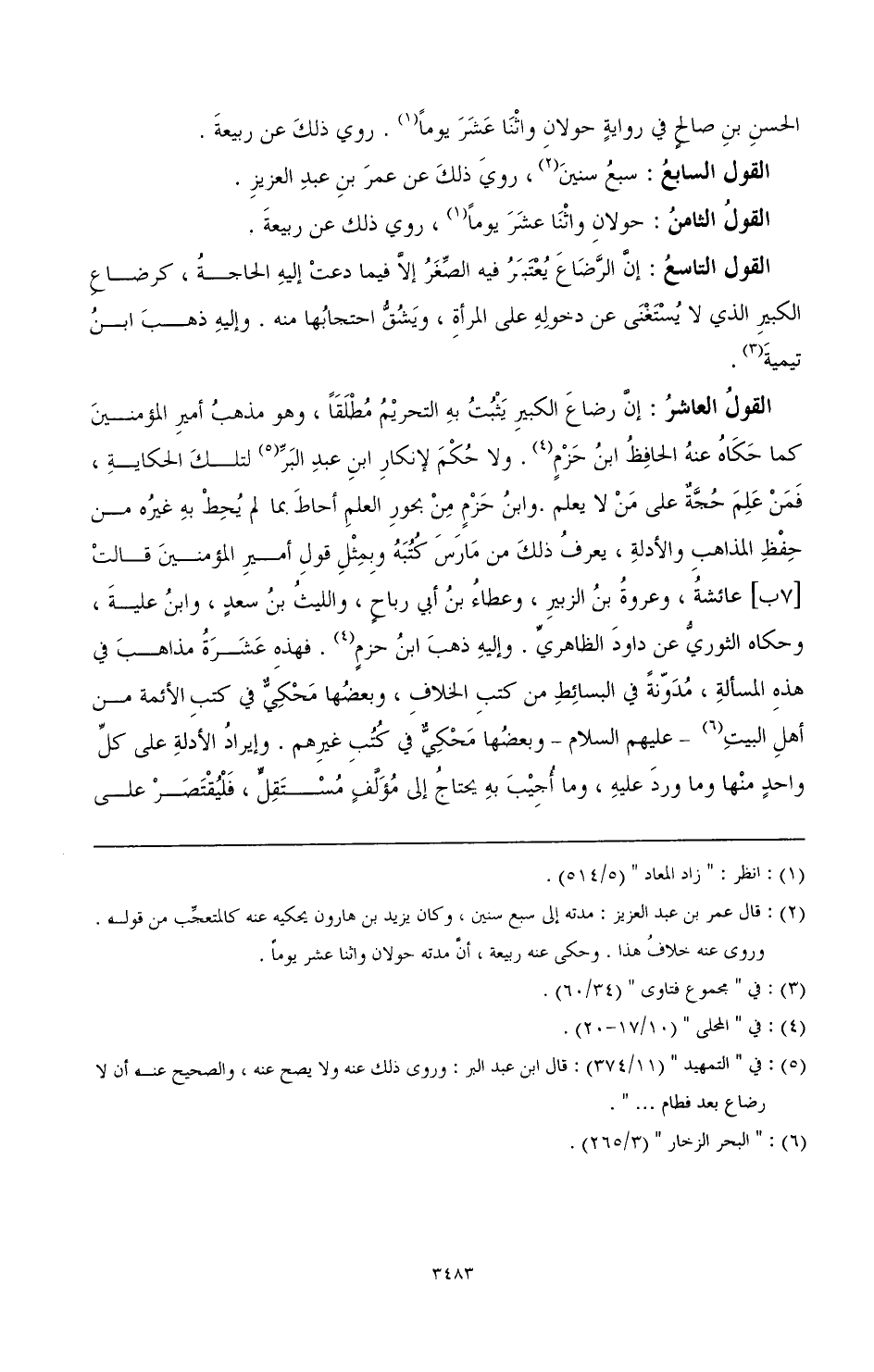 القول العاشر: إن رضاع الكبير يثبت به التحريم مطلقا، وهو مذهب أمير المؤمنين كما حكاه عنه الحافظ ابن حزم (¬5). ولا حكم لإنكار ابن عبد البر (¬6) لتلك الحكاية، فمن علم حجة على من لا يعلم. وابن حزم من بحور العلم أحاط بما لم يحط به غيره من حفظ المذهب والأدلة، يعرف ذلك من مارس كتبه وبمثل قول أمير المؤمنين قالت عائشة، وعروة بن الزبير، وعطاء بن أبي رباح، والليث بن سعد، وابن علية، وحكاه الثوري عن داود الظاهري. وإليه ذهب ابن حزم (¬7). فهذه عشرة مذاهب في هذه المسألة، مدونة في البسائط من كتب الخلاف، وبعضها محكي في كتب الأئمة من أهل البيت (¬8) - عليهم السلام - وبعضها محكي في كتب غيرهم. وإيراد الأدلة على كل واحد منها وما ورد عليه، وما أجيب به يحتاج إلى مؤلف مستقل، فليقتصر على