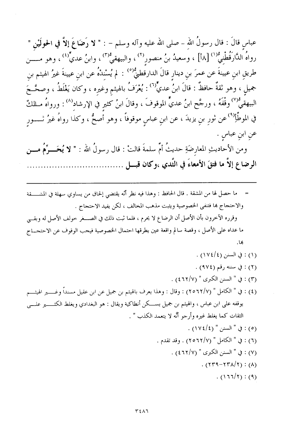 عباس، قال قال رسول الله - صَلَّى اللهُ عَلَيْهِ وَآلِهِ وَسَلَّمَ -: " لا رضاع إلا في الحولين " رواه الدارقطني (¬1)، وسعيد بن منصور (¬2)، والبيهقي (¬3)، وابن عدي (¬4)، وهو من طريق ابن عيينة عن عمر بن دينار، قال الدارقطني (¬5): لم يسنده عن ابن عيينة غير الهيثم بن جميل، وهو ثقة حافظ. قال ابن عدي (¬6): يعرف بالهيثم وغيره، وكان يغلط، وصحح البيهقي (¬7) وقفه، ورجح ابن عدي الموقوف، وقال ابن كثير في الإرشاد (¬8): رواه مالك في الموطأ (¬9) عن ثور بن يزيد، عن ابن عباس موقوفا، وهو أصح، وكذا رواه غير ثور عن ابن عباس.