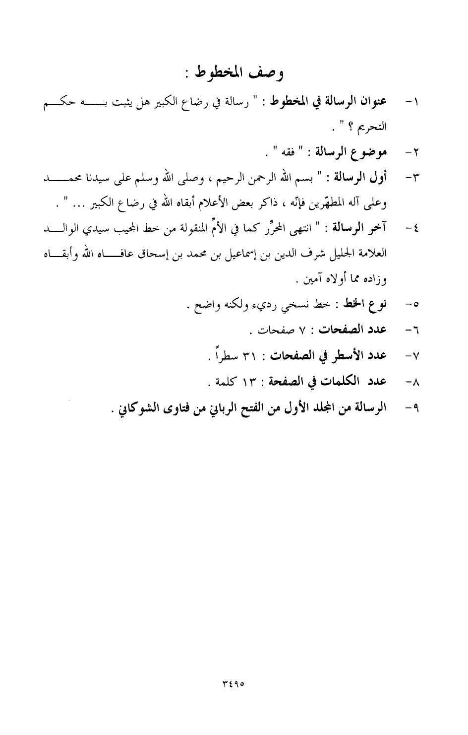 3 - أول الرسالة: بسم الله الرحمن الرحيم، وصلى الله على سيدنا محمد وعلى آله الطاهرين فإنه ذاكر بعض الأعلام أبقاه الله في رضاع الكبير ... ".