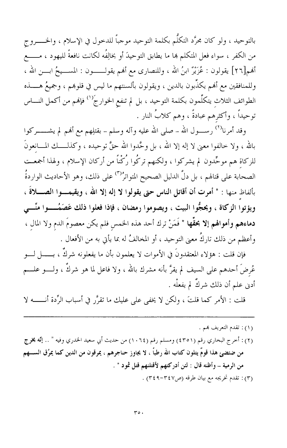 وقد أمرنا (¬2) رسول الله -صَلَّى اللهُ عَلَيْهِ وَآلِهِ وَسَلَّمَ- بقتلهم مع أنهم لم يشركوا بالله، ولا خالفوا معنى لا إله إلا الله، بل وحدوا الله حق توحيده، وكذلك المانعون للزكاة هم موحدون لم يشركوا، ولكنهم تركوا ركنا من أركان الإسلام، ولهذا أجمعت الصحابة على قتالهم، بل دل الدليل الصحيح المتواتر (¬3) على ذلك، وهو الأحاديث الواردة بألفاظ منها: " أمرت أن أقاتل الناس حتى يقولوا لا إله إلا الله، ويقيموا الصلاة، ويؤتوا الزكاة، ويحجوا البيت، ويصوموا رمضان، فإذا فعلوا ذلك عصموا مني دماءهم وأموالهم إلا بحقها " فمن ترك أحد هذه الخمس فلم يكن معصوم الدم ولا المال، وأعظم من ذلك تارك معنى التوحيد، أو المخالف له بما يأتي به من الأفعال.
