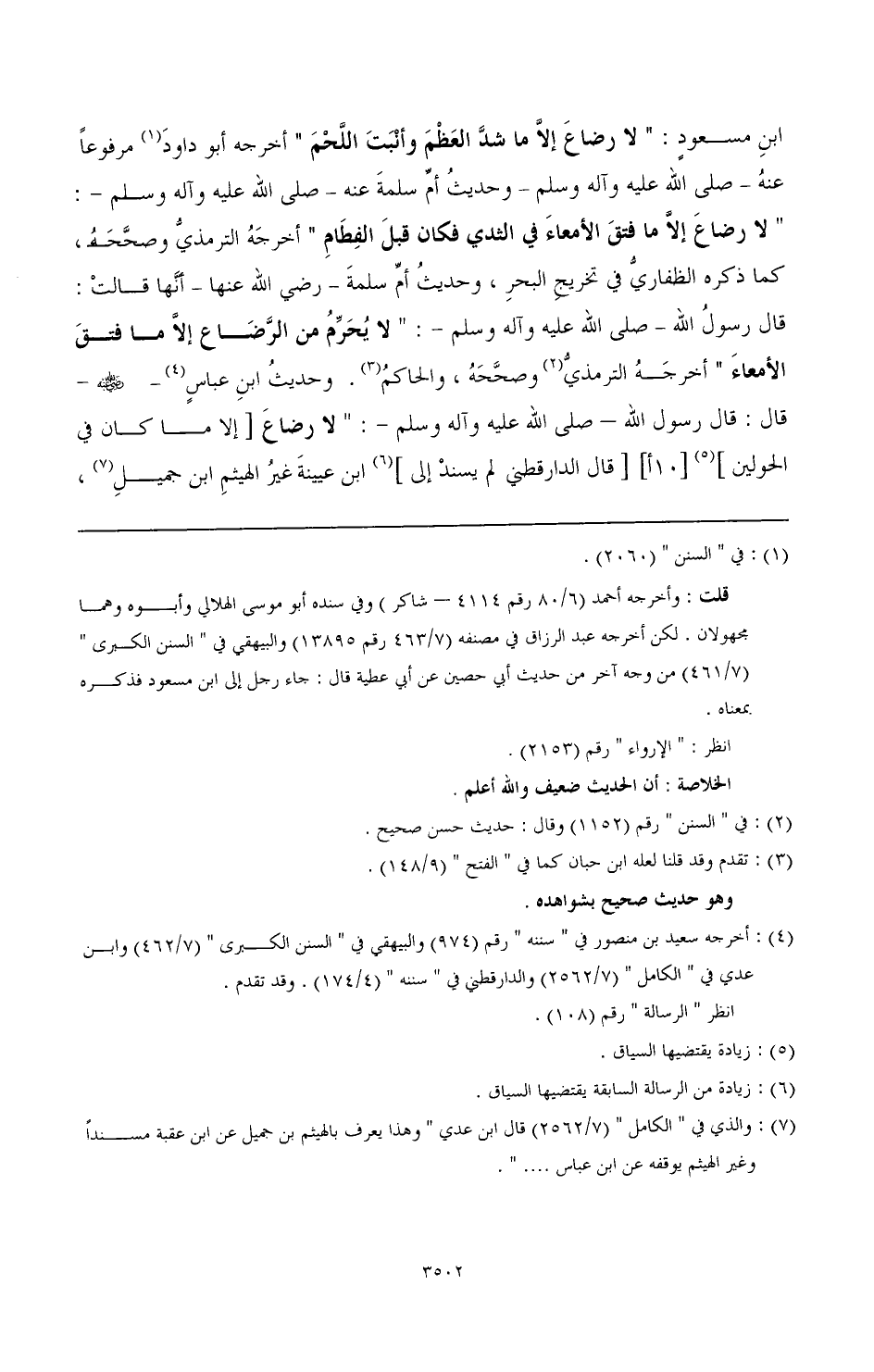 ابن مسعود: " لا رضاع إلا ما شد العظم وأنبت اللحم " أخرجه أبو داود (¬1) مرفوعًا عنه - صَلَّى اللهُ عَلَيْهِ وَآلِهِ وَسَلَّمَ - وجديث أم سلمة عنه - صَلَّى اللهُ عَلَيْهِ وَآلِهِ وَسَلَّمَ -: " لا رضاع إلا ما فتق الأمعاء في الثدي فكان قبل الفطام " أخرجه الترمذي وصححه، كما ذكره الظفاري في تخريج البحر، وحديث أم سلمة رضي الله عنها أنها قالت: قال رسول الله - صَلَّى اللهُ عَلَيْهِ وَآلِهِ وَسَلَّمَ -: " لا يحرم من الرضاع إلا ما فتق الأمعاء " أخرجه الترمذي (¬2) وصححه، والحاكم (¬3). وحديث ابن عباس (¬4) رضي الله عنه قال: قال رسول الله - صَلَّى اللهُ عَلَيْهِ وَآلِهِ وَسَلَّمَ -: لا رضاع [إلا ما كان في الحولين] (¬5) [قال الدارقطني: لم يسند إلى] (¬6) ابن عيينة غير الهيثم بن جميل (¬7)،
