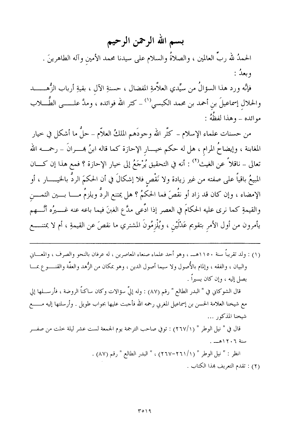 فإنه ورد هذا السؤال من سيدي العلامة المفضال، حسنة الآل، بقية أرباب الزهد والحلال إسماعيل بن أحمد بن محمد الكبسي (¬1) - كثر الله فوائده، ومد على الطلاب موائده - وهذا لفظه: