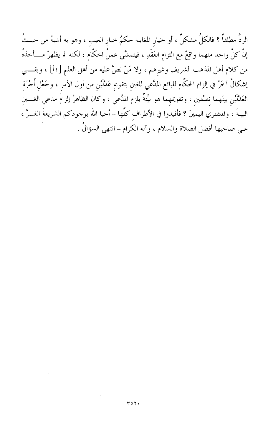 الرد مطلقا؟ فالكل مشكل، أو لخيار المغابنة حكم خيار العيب، وهو به أشبه من حيث إن كل واحد منهما واقع مع التزام العقد، فيتمشى عمل الحكام، لكنه لم يظهر مأخذه من كلام أهل المذهب الشريف وغيرهم، ولا من نص عليه من أهل العلم، وبقي إشكال آخر في إلزام الحكام للبائع المدعي للغبن بتقويم عدلين من أول الأمر، وجعل أجرة العدلين بينهما نصفين، وتقويمهما هو بينة يلزم المدعي، وكان الظاهر إلزام مدعي الغبن البينة، والمشتري اليمين؟ فأفيدوا في الأطراف كلها - أحيا الله بوجودكم الشريعة الغراء، على صاحبها أفضل الصلاة والسلام، وآله الكرام - انتهى السؤال.