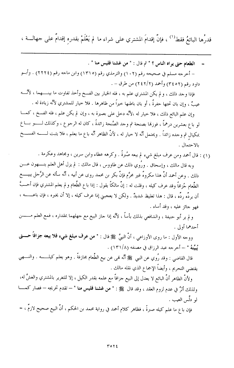 ووجه الأول: ما روى الأوزاعي، أن النبي صَلَّى اللهُ عَلَيْهِ وَسَلَّمَ قال: " من عرف مبلغ شيء فلا يبعه جزافا حتى يبينه " - أخرجه عبد الرزاق في مصنفه (8/ 131).