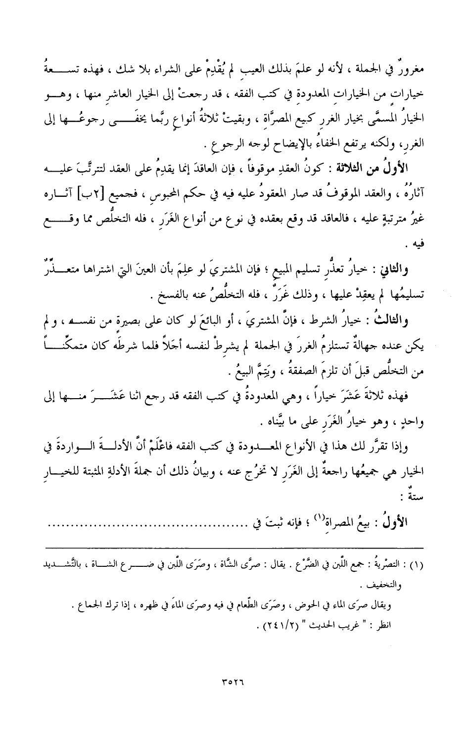 مغرور في الجملة؛ لأنه لو علم بذلك العيب لم يقدم على الشراء بلا شك، فهذه تسعة خيارات من الخيارات المعدودة في كتب الفقه، قد رجعت إلى الخيار العاشر منها، وهو الخيار المسمى بخيار الغرر، كبيع المصراة، وبقيت ثلاثة أنواع ربما يخفى رجوعها إلى الغرر، ولكنه يرتفع الخفاء بالإيضاح لوجه الرجوع.