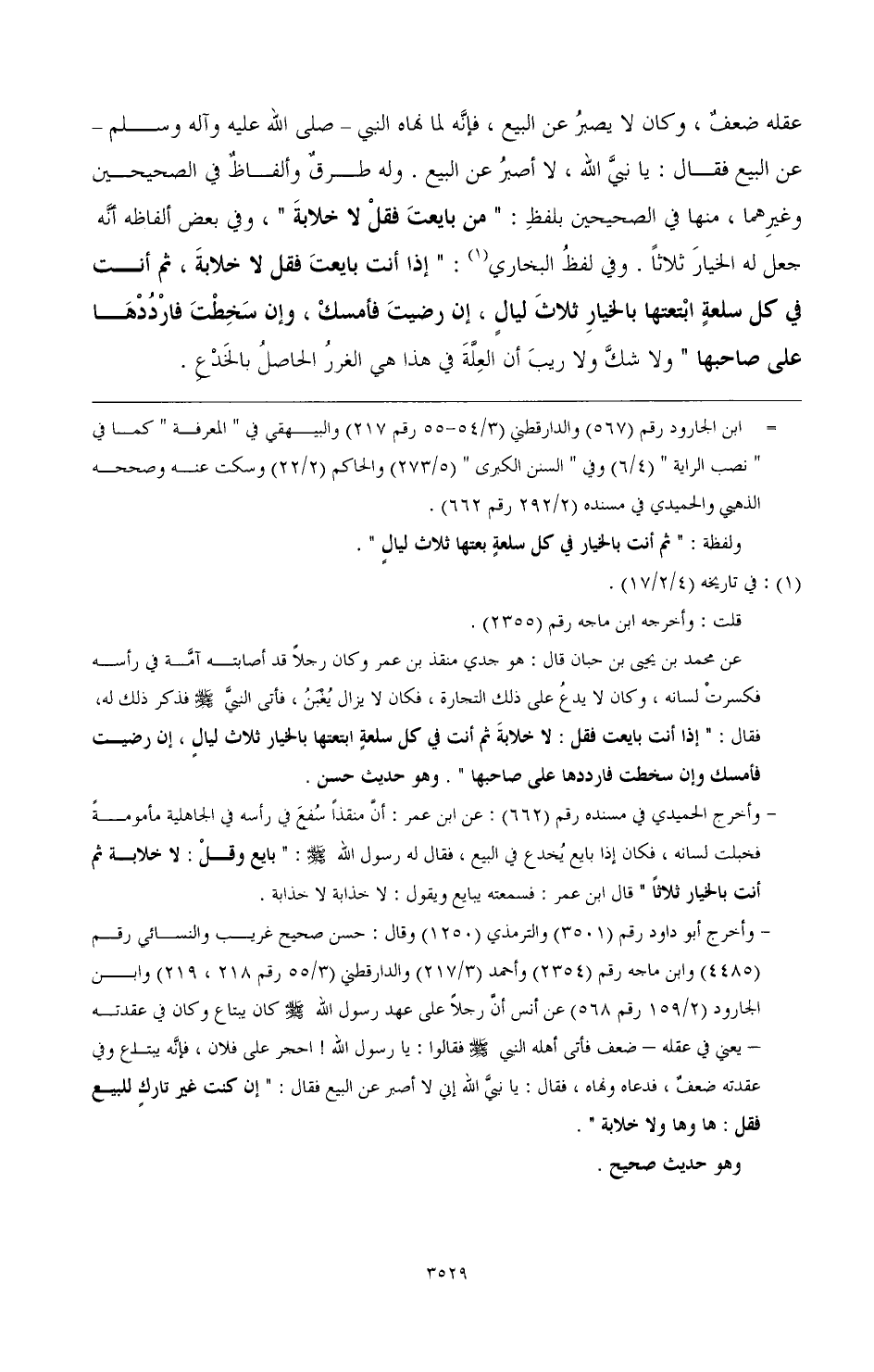 عقله ضعف، وكان لا يصبر عن البيع؛ فإنه لما نهاه النبي - صَلَّى اللهُ عَلَيْهِ وَآلِهِ وَسَلَّمَ - عن البيع فقال: يا نبي الله، لا أصبر عن البيع. وله طرق وألفاظ في الصحيحين وغيرهما، منها في الصحيحين بلفظ: " من بايعت فقل: لا خلابة "، وفي بعض ألفاظه أنه جعل له الخيار ثلاثا. وفي لفظ البخاري (¬1): " إذا أنت بايعت فقل: لا خلابة، ثم أنت في كل سلعة ابتعتها بالخيار ثلاث ليال، إن رضيت فأمسك، وإن سخطت فارددها على صاحبها " ولا شك ولا ريب أن العلة في هذا هي الغرر بالخدع.