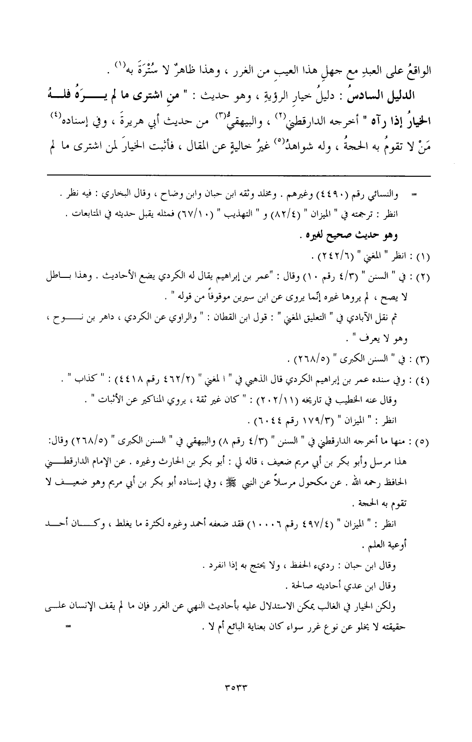 الدليل السادس: دليل خيار الرؤية، وهو حديث: " من اشترى ما لم يره فله الخيار إذا رآه " أخرجه الدارقطني (¬2) والبيهقي (¬3) من حديث أبي هريرة، وفي إسناده (¬4) من لا تقوم به الحجة، وله شواهد (¬5) غير خالية عن المقال، فأثبت الخيار لمن اشترى ما لم