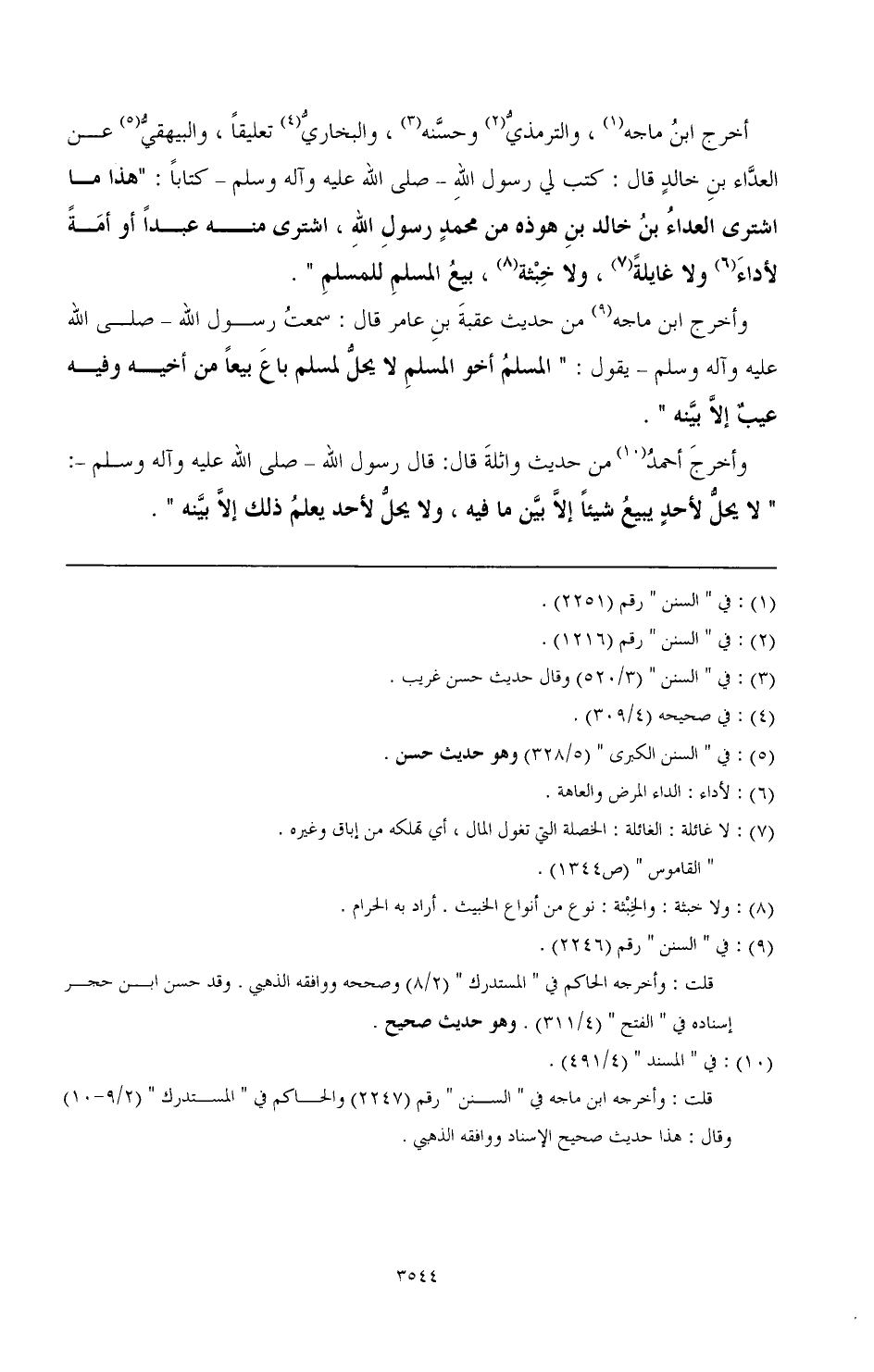 أخرج ابن ماجه (¬1) والترمذي (¬2) وحسنه (¬3)، والبخاري (¬4) تعليقا، والبيهقي (¬5) عن العداء بن خالد قال: كتب رسول الله - صَلَّى اللهُ عَلَيْهِ وَآلِهِ وَسَلَّمَ - كتابا: " هذا ما اشترى العداء بن خالد بن هوذة من محمد رسول الله، اشترى منه عبدا أو أمة لأداء (¬6) ولا غايلة (¬7)، ولا خبثة (¬8)، بيع المسلم للمسلم ".