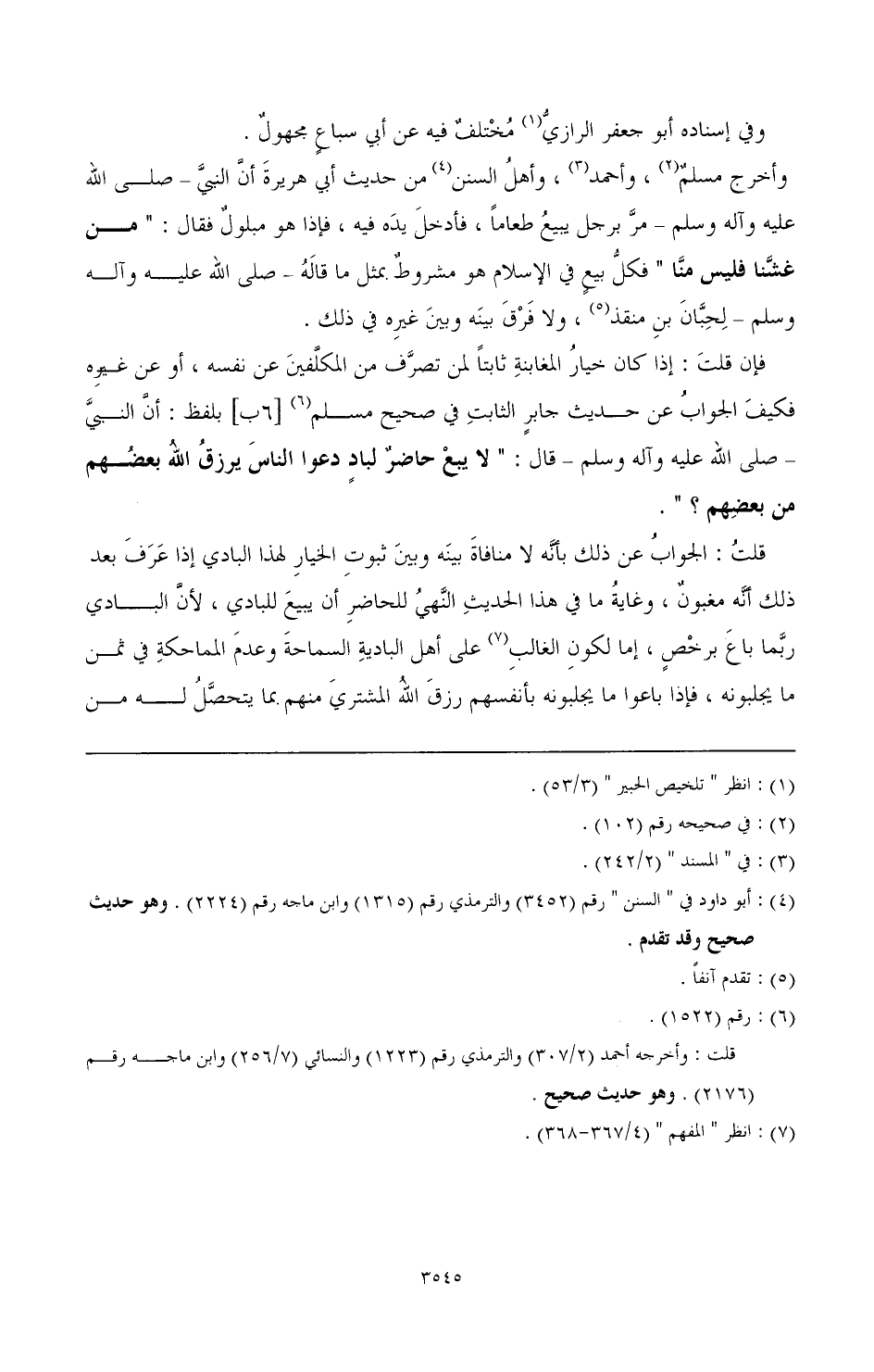 وأخرج مسلم (¬2)، وأحمد (¬3)، وأهل السنن (¬4) من حديث أبي هريرة أن النبي - صَلَّى اللهُ عَلَيْهِ وَآلِهِ وَسَلَّمَ - مر برجل يبيع طعاما، فأدخل يده فيه، فإذا هو مبلول، فقال: " من غشنا فليس منا " فكل بيع في الإسلام هو مشروط بمثل ما قاله - صَلَّى اللهُ عَلَيْهِ وَآلِهِ وَسَلَّمَ - لحبان بن منقذ (¬5)، ولا فرق بينه وبين غيره في ذلك.