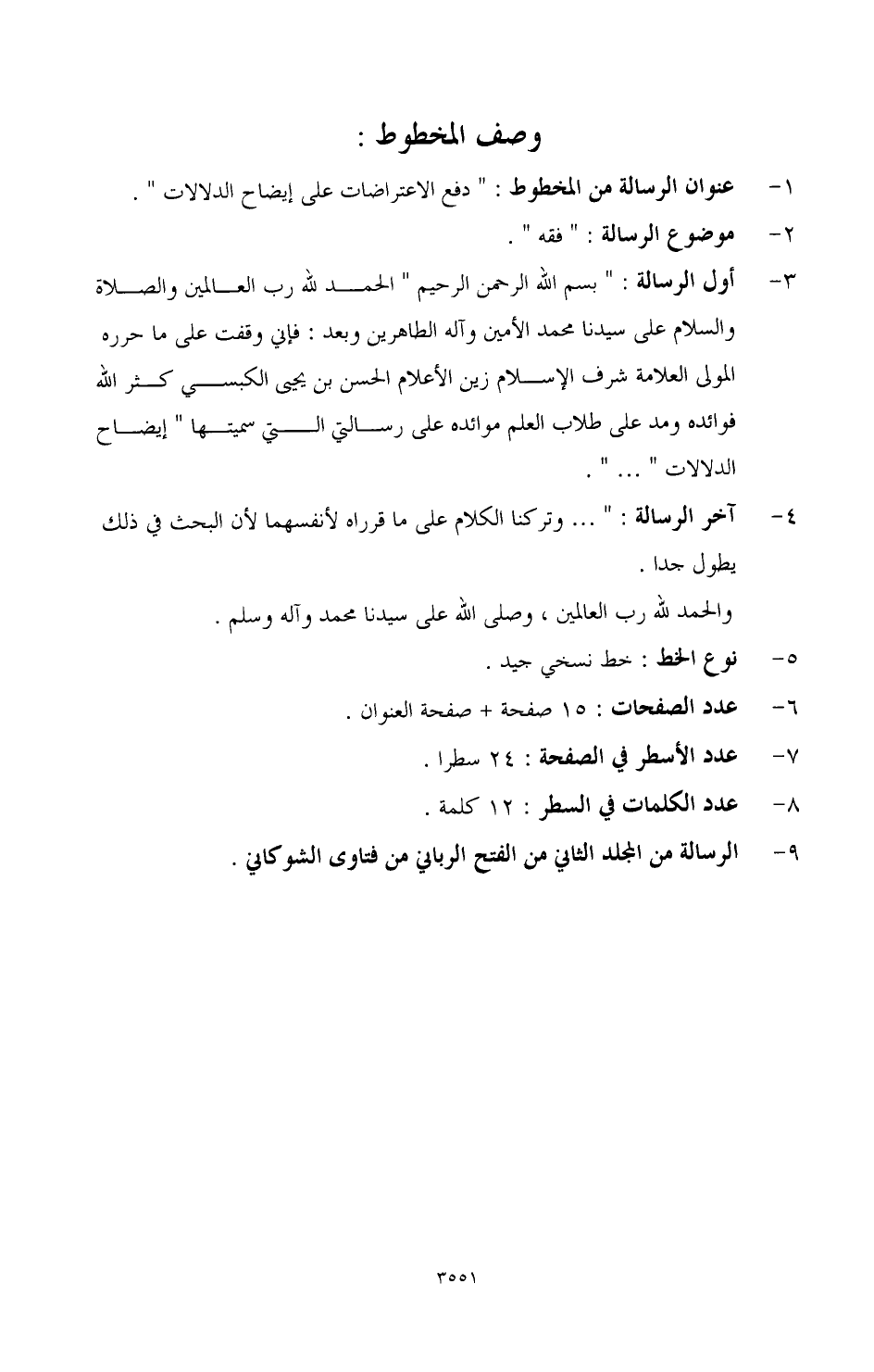 3 - أول الرسالة: " بسم الله الرحمن الرحيم " الحمد لله رب العالمين والصلاة والسلام على سيدنا محمد الأمين وآله الطاهرين بعد: فإني وقفت على ما حرره المولى العلامة شرف الإسلام زين الأعلام الحسن بن يحيى الكبسي كثر الله فوائده ومد على طلاب العلم موائده على رسالتي التي سميتها " إيضاح الدلالات " ... "