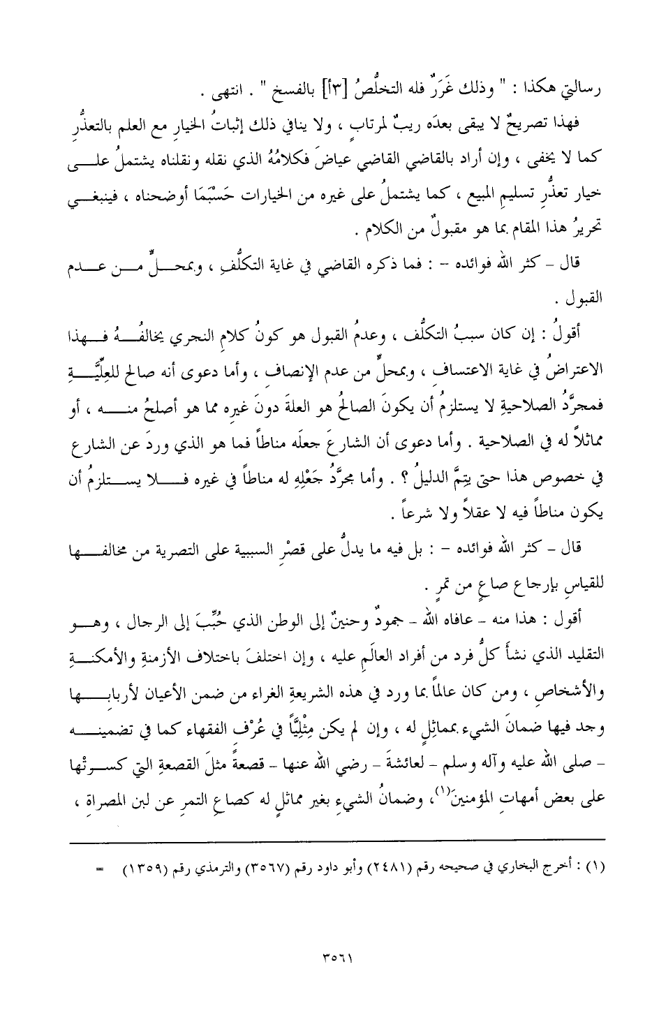أقول: هذا منه - عافاه الله - جمود وحنين إلى الوطن الذي حبب إلى الرجال، وهو التقليد الذي نشأ كل فرد من أفراد العالم عليه وإن اختلف باختلاف الأزمنة والأمكنة والأشخاص، ومن كان عالما بما ورد من في الشريعة الغراء ضمن الأعيان لأربابها وجد فيها ضمان الشيء بمماثل له، وإن لم يكن مثليا في عرف الفقهاء كما في تضمينه - صَلَّى اللهُ عَلَيْهِ وَآلِهِ وَسَلَّمَ - ولعائشة - رضي الله عنها - قصعة مثل القصعة التي كسرتها على بعض أمهات المؤمنين (¬1)، وضمان الشيء بغير مماثل له كصاع التمر عن لبن المصراة،