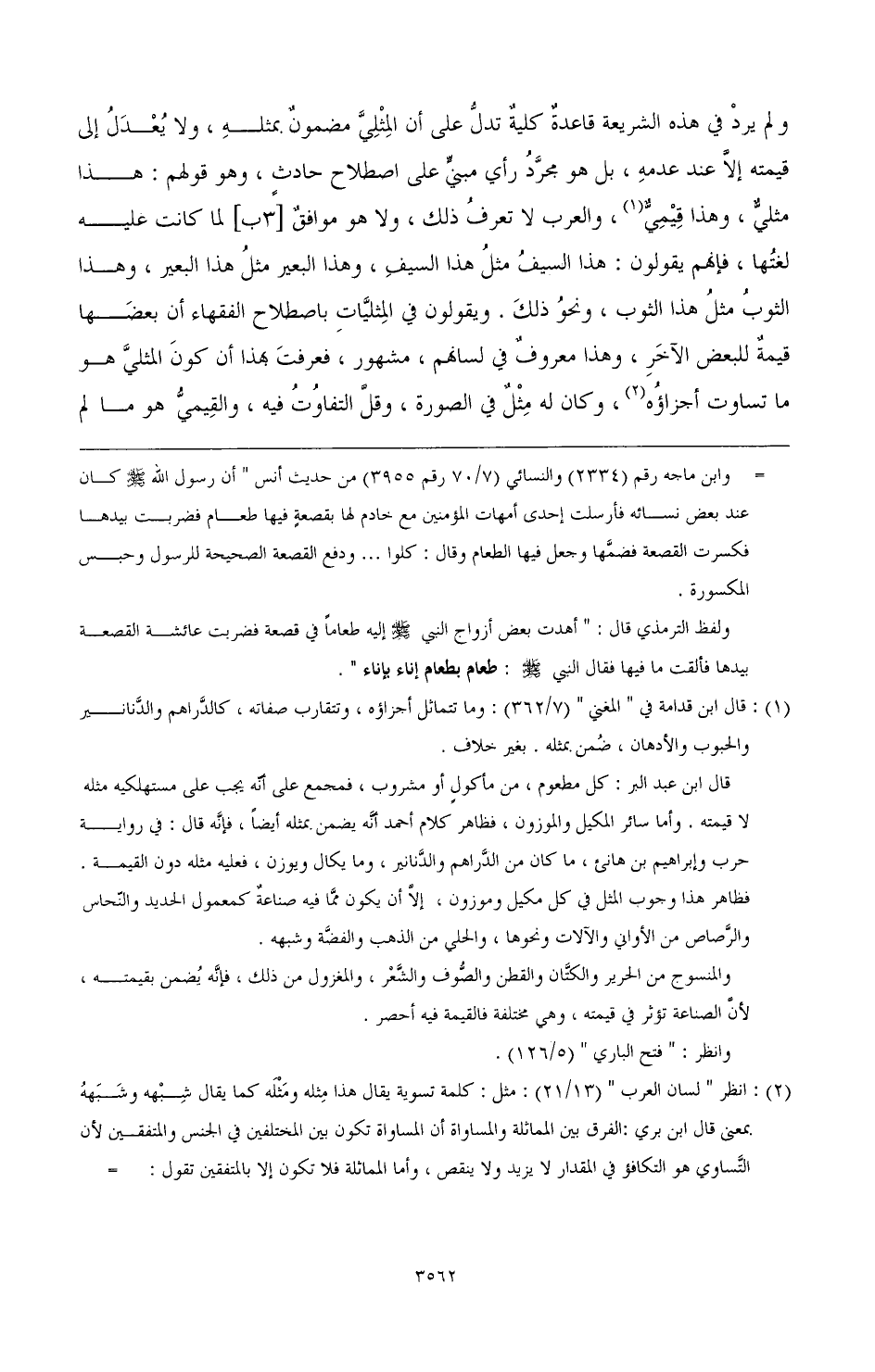 ولم يرد في الشريعة قاعدة كلية تدل على أن المثلي مضمون بمثله، ولا يعدل إلى قيمته إلا عند عدمه، بل هو مجرد رأي مبني على اصطلاح حادث وهو قولهم: هذا مثلي، وهذا قيمي (¬1)، والعرب لا تعرف ذلك، ولا هو موافق لما كانت عليه لغتها، فإنهم يقولون: هذا السيف مثل هذا السيف، وهذا البعير مثل هذا البعير، وهذا الثوب مثل هذا الثوب، ونحو ذلك. ويقولون في المثليات باصطلاح الفقهاء أن بعضها قيمة للبعض الآخر، وهذا معروف في لسانهم، مشهور، فعرفت بهذا أن كون المثلي هو ما تساوت أجزاؤه (¬2)، وكان له مثل في الصورة، وقل التفاوت فيه، والقيمي هو ما لم