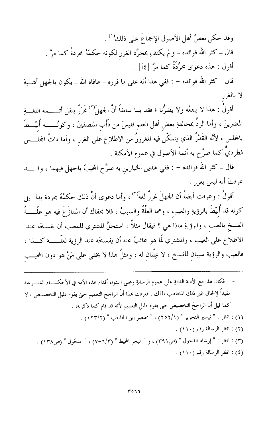 هذا لا ينفعه ولا يضرنا؛ فقد بينا سابقا أن الجهل (¬2) غرر بنقل أئمة اللغة المعتبرين، وأما الرد بمخالفة بعض أهل العلم فليس من دأب المنصفين، وكونه أنيط بالمجلس، لأنه القدر الذي يتمكن فيه المغرور من الاطلاع على الغرر وأما ذات المجلس فطردي كما صرح به أئمة الأصول في عموم الأمكنة.