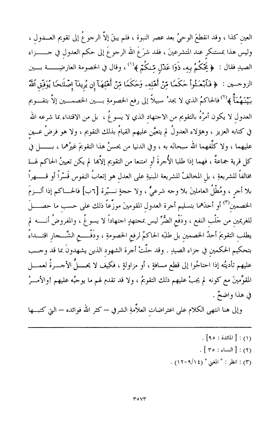 العين كذا، وانقطع الوحي بعد عصر النبوة، فلم يبق إلا الرجوع إلى التقويم العدول، وليس هذا بمستنكر عند المتشرعين، فقد شرع الله الرجوع إلى حكم العدول في جزاء الصيد فقال: [يَحْكُمُ بِهِ ذَوَا عَدْلٍ مِنْكُمْ] (¬1)، وقال في الخصومة العارضة بين الزوجين: [فَابْعَثُوا حَكَمًا مِنْ أَهْلِهِ وَحَكَمًا مِنْ أَهْلِهَا إِنْ يُرِيدَا إِصْلَاحًا يُوَفِّقِ اللَّهُ بَيْنَهُمَا] (¬2) فالحاكم الذي لا يجد سبيلا إلى الخصومة بين الخصمين إلا بتقويم العدول لا يكون أمره بالتقويم من الاجتهاد الذي لا يسوغ، بل من الإقتداء بما شرعه الله في كتابه العزيز، هؤلاء العدول لا يكون لم يتعين عليهم القيام بذلك التقويم، ولا هو فرض عين عليهما، ولا كلفهما الله سبحانه به، وفى الدنيا من يحسن هذا التقويم غيرهما، بل في كل قرية جماعة، فهما إذا طلبا الأجرة أو امتنعا من التقويم إلا بها لم يكن تعيين الحاكم لها مخالفة للشريعة بل المخالف للشريعة المبنية على العدل هو إتعاب النفوس قسرا أو قهرا بلا أجر، ومطل العاملين بلا وجه شرعي، ولا حجة نيره فالحاكم إذا ألزم الخصمين (¬3) أو أحدهما بتسليم أجرة العدول المقومين موزعا ذلك على حسب ما حصل للغريمين من جلب النفع، ودفع الضر ليس يجتهد اجتهادا لا يسوغ، والمفروض أنه لم يطلب التقويم أحد الخصمين بل طلبه الحاكم لرفع الخصومة، ودفع الشجار إقتداء بتحكيم الحكمين في جزاء الصيد. وقد حلت أجرة الشهود الذين يشهدون بما قد وجب عليهم تأديته إذا احتاجوا إلى قطع مسافة، أو مزاولة، فكيف لا يحل الأجرة لعمل المقومين مع كونه لم يجب عليهم ذلك التقويم، ولا تقدم لهم ما يوجبه عليهم! والأمر في هذا واضح.