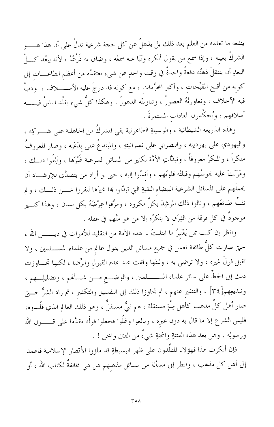 وانظر إن كنت ممن يعتبر ما ابتليت به هذه الأمة من التقليد للأموات في دين الله، حتى صارت كل طائفة تعمل في جميع مسائل الدين بقول عالم من علماء المسلمين، ولا تقبل قول غيره، ولا ترضى به، وليتها وقفت عند عدم القبول والرضا، لكنها تجاوزت ذلك إلى الحط على سائر علماء المسلمين، والوضع من شأنهم، وتضليلهم، وتبديعهم [34]، والتنفير عنهم، ثم تجاوزا ذلك إلى التفسيق والتكفير، ثم زاد الشر حتى صار أهل كل مذهب كأهل ملة مستقلة، لهم نبي مستقل، وهو ذلك العالم الذي قلدوه، فليس الشرع إلا ما قال به دون غيره، وبالغوا وغلوا فجعلوا قوله مقدما على قول الله ورسوله. وهل بعد هذه الفتنة والمحنة شيء من الفتن والمحن!.