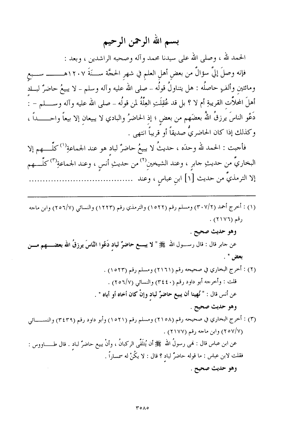 فإنه وصل إلى سؤال من بعض أهل العلم في شهر الحجة سنة 1207هـ سبع ومائتين وألف حاصله: هل يتناول قوله - صَلَّى اللهُ عَلَيْهِ وَآلِهِ وَسَلَّمَ - لا يبيع حاضر لباد أهل المحلات القريبة أم لا؟ بل عقلت العلة لمن قوله -صَلَّى اللهُ عَلَيْهِ وَآلِهِ وَسَلَّمَ -: دعوا الناس يرزق الله بعضهم من بعض؛ إذ الحاضر والبادي لا يبيعان إلا بيعا واحدا، وكذلك إذا كان الحاضري صديقا أو قريبا انتهى.