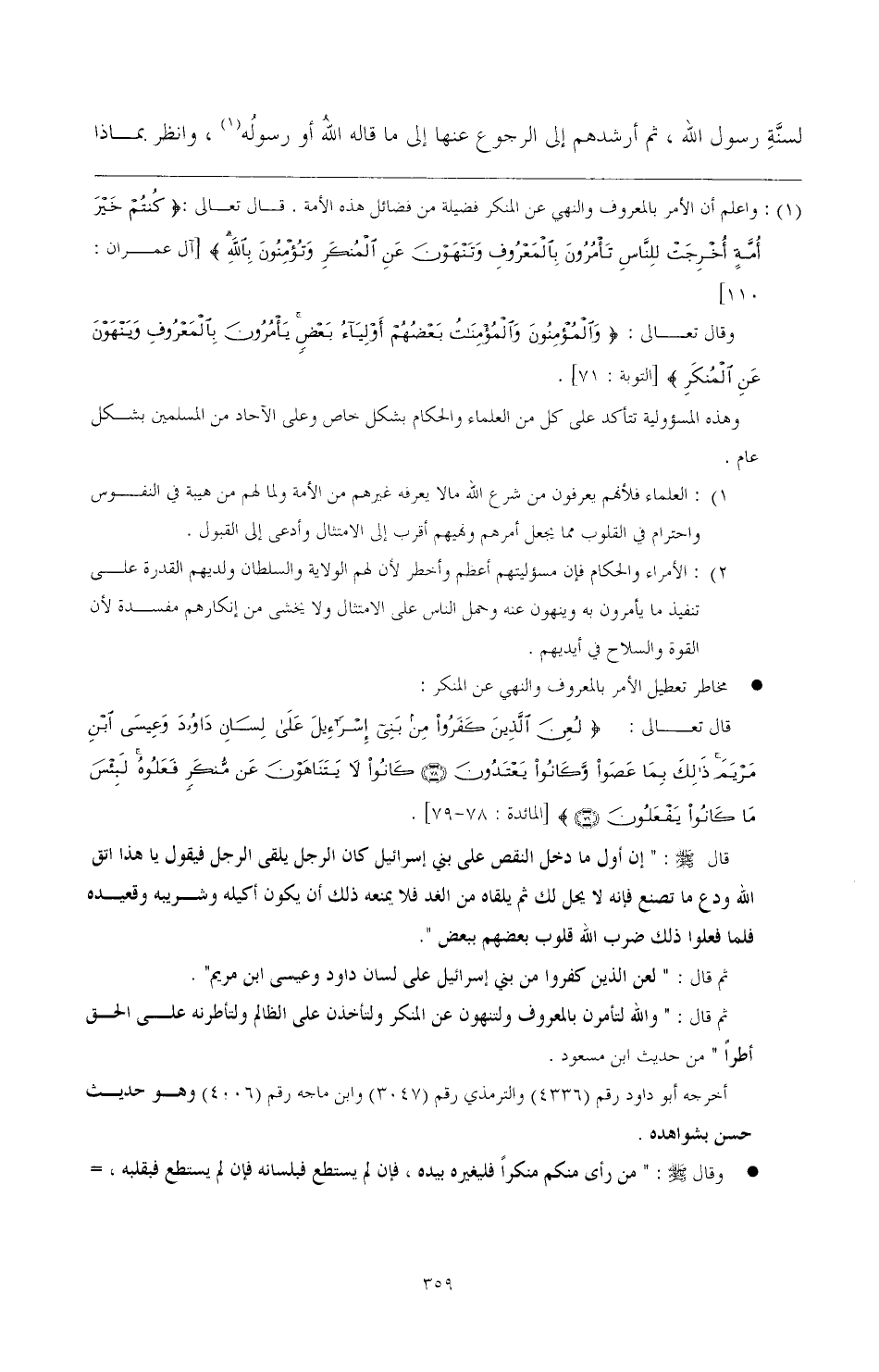 (¬1) واعلم أن الأمر بالمعروف والنهي عن المنكر فضيلة من فضائل هذه الأمة. قال تعالى: (كنتم خير أمة أخرجت للناس تأمرون بالمعروف وتنهون عن المنكر وتؤمنون بالله) [آل عمران:110]. وقال تعالى: (والمؤمنون والمؤمنات بعضهم أولياء بعض يأمرون بالمعروف وينهون عن المنكر) [التوبة: 71]. وهذه المسئولية تتأكد على كل من العلماء والحكام بشكل خاص وعلى الآحاد من المسلمين بشكل عام.