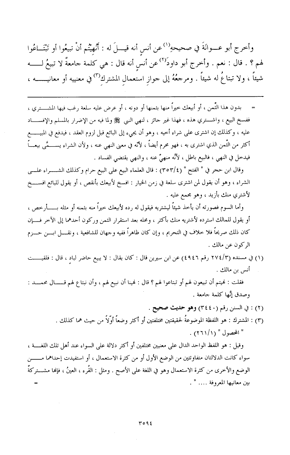وأخرج أبو عوانة في صحيحه (¬1) عن أنس أنه قيل له: أنهيتم أن تبيعوا أو تبتاعوا لهم؟. قال: نعم وأخرج أبو داود (¬2) عن أنس أنه قال: هي كلمة جامعة لا تبيع له شيئا، ولا تبتاع له شيئا. ومرجعه إلى جواز استعمال المشترك (¬3) في معنييه أو معانيه،
