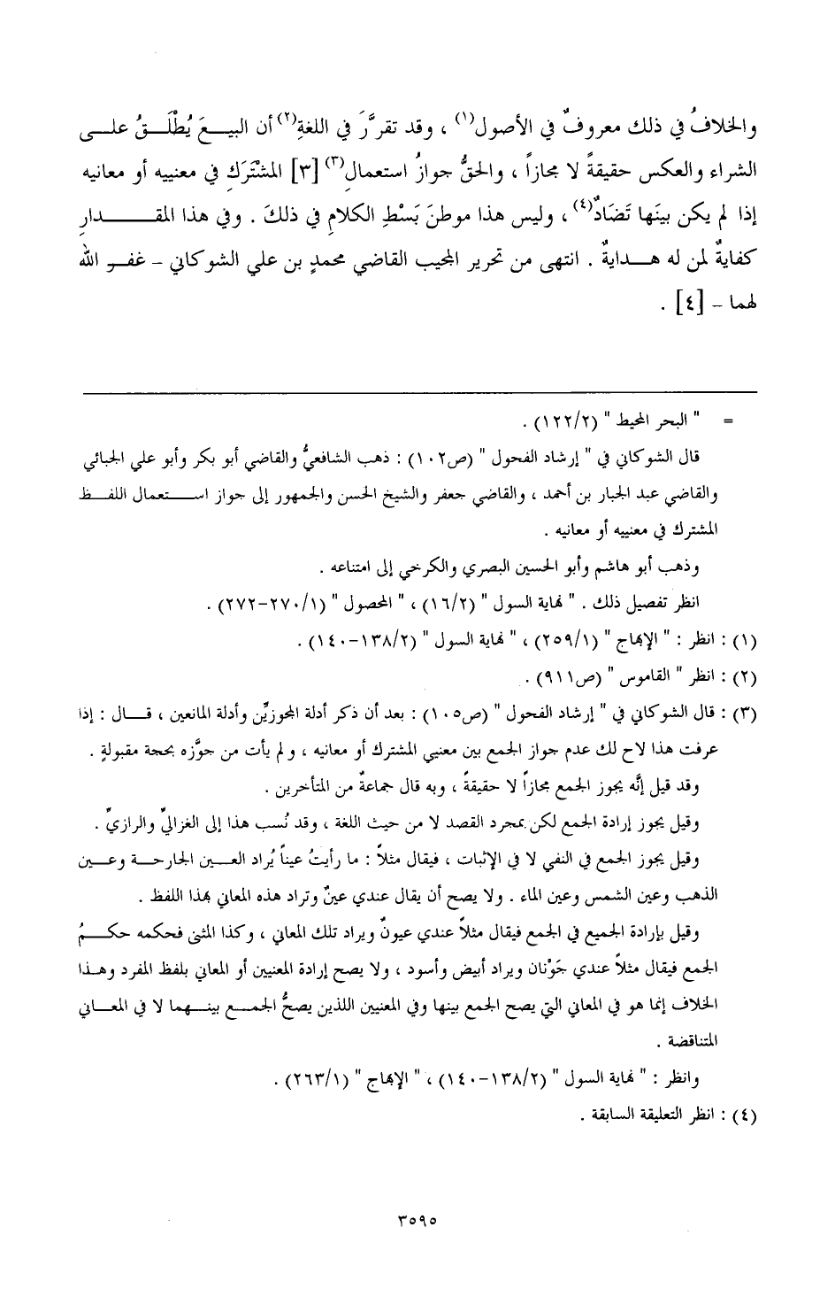 (¬3) قال الشوكاني في " إرشاد الفحول " (ص105): بعد أن ذكر أدلة المجوزين وأدلة المانعين، قال: إذا عرفت هذا لاح لك عدم جواز الجمع بين معنى مشترك أو معانيه، ولم يأت من جوزه بحجة مقبولة.