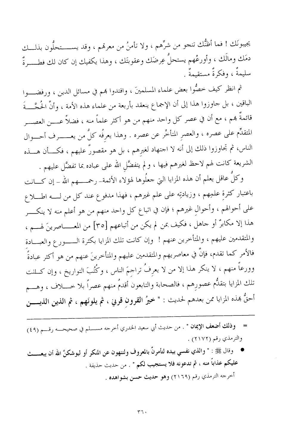 وكل عاقل يعلم أن هذه المزايا التي جعلوها لهؤلاء الأئمة رحمهم الله - إن كانت باعتبار كثرة علمهم، وزيادته على علم غيرهم، فهذا مدفوع عند كل من له اطلاع على أحوالهم، وأحوال غيرهم؛ فإن في أتباع كل واحد منهم من هو أعلم منه لا ينكر هذا إلا مكابر أو جاهل، فكيف بمن لم يكن من أتباعهم [35] من المعاصرين لهم، والمتقدمين عليهم، والمتأخرين عنهم! وإن كانت تلك المزايا بكثرة الورع والعبادة فالأمر كما تقدم، فإن في معاصريهم والمتقدمين عليهم والمتأخرين عنهم من هو أكثر عبادة وورعا منهم، لا ينكر هذا إلا من لا يعرف تراجم الناس، وكتب التواريخ، وإن كانت تلك المزايا بتقدم عصورهم، فالصحابة والتابعون أقدم منهم عصرا بلا خلاف، وهم أحق هذه المزايا ممن بعدهم لحديث: "خير القرون قرني، ثم الذين يلونهم، ثم الذين