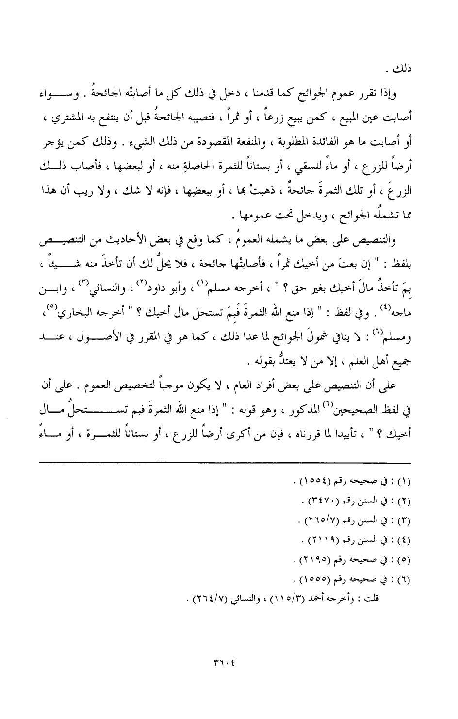 والتنصيص على بعض ما يشمله العموم، كما وقع في بعض الأحاديث من التنصيص بلفظ " إن بعت من أخيك ثمرا، فأصابته جائحة فلا يحل لك أن تأخذ منه شيئا، بم تأخذ مال أخيك بغير حق؟ "، أخرجه مسلم (¬1)، وأبو داود (¬2)،والنسائي (¬3)، وابن ماجه (¬4). وفي لفظ " إذا منع الله الثمرة فبم تستحل مال أخيك؟ " أخرجه البخاري (¬5)، ومسلم (¬6): لا ينافي شمول الجوائح لما عدا ذلك، كما هو في المقرر في الأصول، عند جميع أهل العلم، إلا من يعتد بقوله.