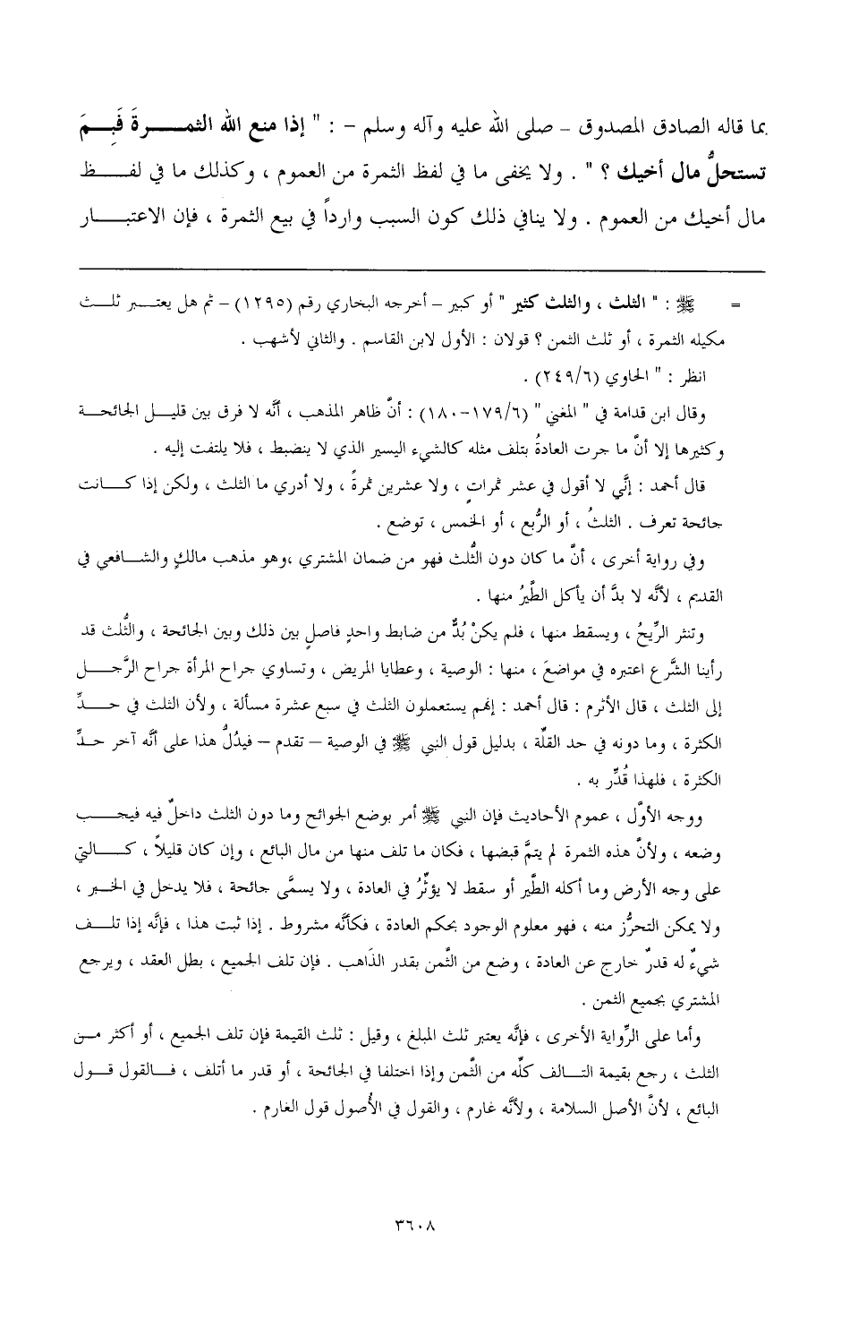 بما قاله الصادق المصدوق - صَلَّى اللهُ عَلَيْهِ وَآلِهِ وَسَلَّمَ -: " إذا منع الله الثمرة فبم تستحل مال أخيك؟ ". ولا يخفى ما في لفظ الثمرة من العموم، وكذلك ما في لفظ مال أخيك من العموم. ولا ينافي كون السبب واردا في بيع الثمرة، فإن الاعتبار