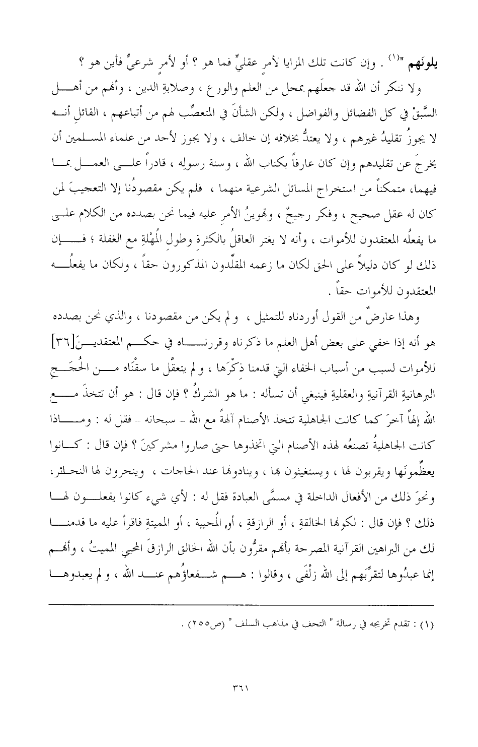 وهذا عارض من القول أوردناه للتمثيل، ولم يكن من مقصودنا، والذي نحن بصدده هو أنه إذا خفي على بعض أهل العلم ما ذكرناه وقررناه في حكم المعتقدين [36] للأموات لسبب من أسباب الخفاء التي قدمنا ذكرها، ولم يتعقل ما سقناه من الحجج البرهانية القرآنية والعقلية فينبغي أن تسأله: ما هو الشرك؟ فإن قال: هو أن تتخذ مع الله إلها آخر كما كانت الجاهلية تتخذ الأصنام آلهة مع الله -سبحانه- فقل له: وماذا كانت الجاهلية تصنعه لهذه الأصنام التي اتخذوها حتى صاروا مشركين؟ فإن قال: كانوا يعظمونها ويقربون لها، ويستغيثون بها، وينادونها عند الحاجات، وينحرون لها النحائر، ونحو ذلك من الأفعال الداخلة في مسمى العبادة فقل له: لأي شيء كانوا يفعلون لها ذلك؟ فإن قال: لكونها الخالقة، أو الرازقة، أو المحيية، أو المميتة فاقرأ عليه ما قدمنا لك من البراهين القرآنية المصرحة بأنهم مقرون بأن الله الخالق الرازق المحيي المميت، وأنهم إنما عبدوها لتقربهم إلى الله زلفى، وقالوا: هم شفعاؤهم عند الله، ولم يعبدوها