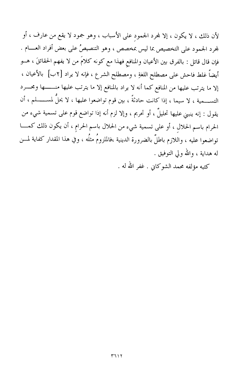 لأن ذلك، لا يكون، إلا لمجرد الجمود على الأسباب، وهو لا يقع من عارف، أو لمجرد الجمود بما ليس مخصص، وهو التنصيص على بعض أفراد العام. فإن قال القائل: بالفرق بين الأعيان والمنافع فهذا مع كونه كلام من لا يفهم الحقائق، هو أيضًا غلط فاحش على مصلحة اللغة، ومصطلح الشرع، فإنه لا يراد بالأعيان، إلا ما يترتب عليها من المنافع كما أنه لا يراد بالمنافع إلا ما يترتب عليها منها وبمجرد التسمية، لا سيما إذا كانت حادثة، بين قوم تواضعوا عليها، لا يحل لمسلم، أن يقول: إنه ينبني عليها تحليل، أو تحريم، وإلا لزم أنه إذا تواضع قوم على تسمية شيء من الحرام باسم الحلال، أو على تسمية شيء من الحلال باسم الحرام، أن يكون ذلك كما تواضعوا عليه، واللازم باطل بالضرورة الدينية، فالملزوم مثله، وفي هذا المقدار كفاية لمن له هداية، والله ولي التوفيق.