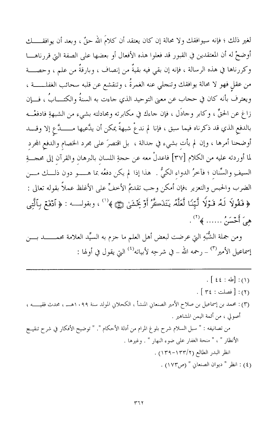 ومن جملة الشبه التي عرضت لبعض أهل العلم ما جزم به السيد العلامة محمد بن إسماعيل الأمير (¬3) -رحمه الله- في شرحه لأبياته (¬4) التي يقول في أولها: