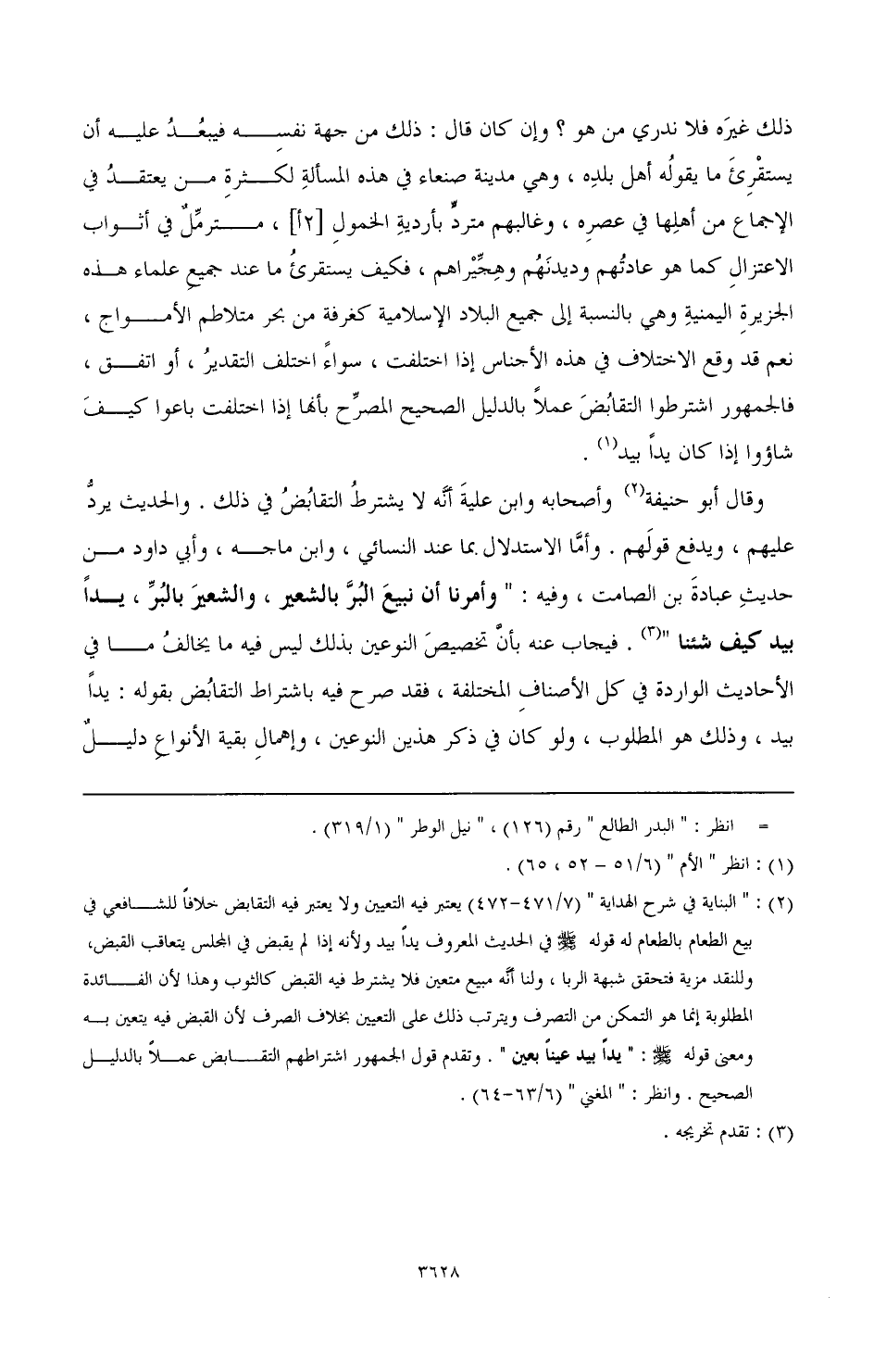 (¬2) " البناية في شرح الهداية " (7/ 471 - 472) يعتبر فيه التعيين ولا يعتبر فيه التقابض خلافا للشافعي في بيع الطعام بالطعام له قوله صَلَّى اللهُ عَلَيْهِ وَسَلَّمَ في الحديث المعروف يدا بيد ولأنه إذا لم يقبض في المجلس يتعاقب بالقبض، وللنقد مزيد فتحقق شبهة الربا، ولنا أنه مبيع متعين فلا يشترط فيه القبض كالثوب وهذا لأن الفائدة المطلوبة إنما هو التمكن من التصرف ويترتب ذلك على التعيين بخلاف الصرف لأن القبض فيه يتعين به ومعني قوله صَلَّى اللهُ عَلَيْهِ وَسَلَّمَ: " يدا بيد عينا بعين ". وتقدم قول الجمهور اشتراطهم التقابض عملا بالدليل الصحيح. انظر: " المغني " (6/ 63 - 64)
