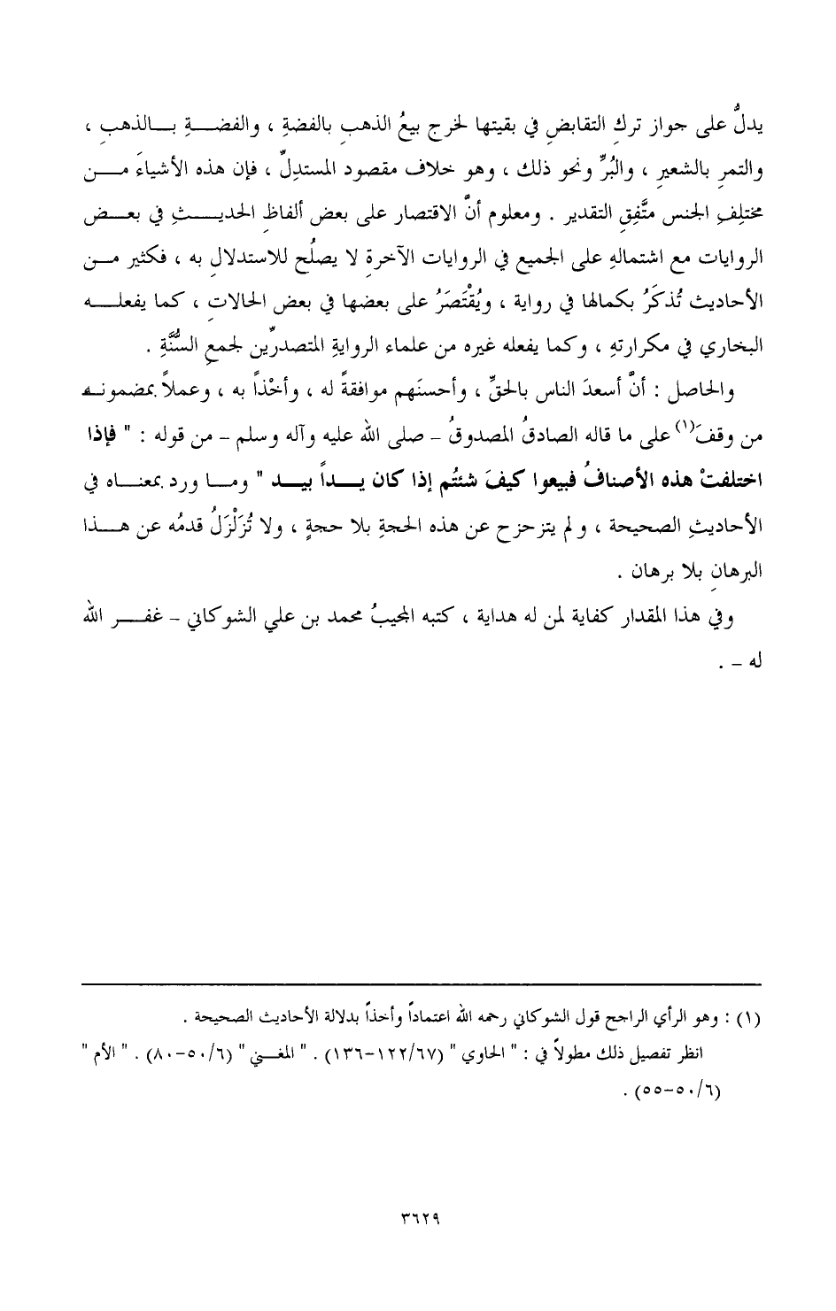 والحاصل: أن أسعد الناس بالحق، وأحسنهم موافقة له، وأخذ به، وعملا بمضمونه من وقف (¬1) على قاله الصادق المصدوق - صَلَّى اللهُ عَلَيْهِ وَآلِهِ وَسَلَّمَ - من قوله: " فإذا اختلفت هذه الأصناف فبيعوا كيف شئتم إذا كان يدا بيد " وما ورد بمعناه في الأحاديث الصحيحة , ولم يتزحزح عن هذه الحجة بلا حجة، ولا تزلزل قدمه عن هذا البرهان بلا برهان.