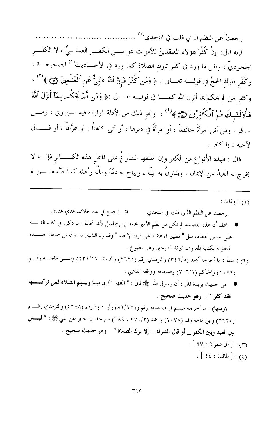 فإنه قال: إن كفر هؤلاء المعتقدين للأموات هو من الكفر العملي، لا الكفر الجحودي، ونقل ما ورد في كفر تارك الصلاة كما ورد في الأحاديث (¬2) الصحيحة، وكفر تارك الحج في قوله تعالى:} ومن كفر فإن الله غني عن العالمين {(¬3)، وكفر من لم يحكم بما أنزل الله كما في قوله تعالى:} ومن لم يحكم بما أنزل الله فأولئك هم الكافرون {(¬4)، ونحو ذلك من الأدلة الواردة فيمن زنى، ومن سرق، ومن أتى امرأة حائضا، أو امرأة في دبرها، أو أتى كاهنا، أو عرافا، أو قال لأخيه: يا كافر.