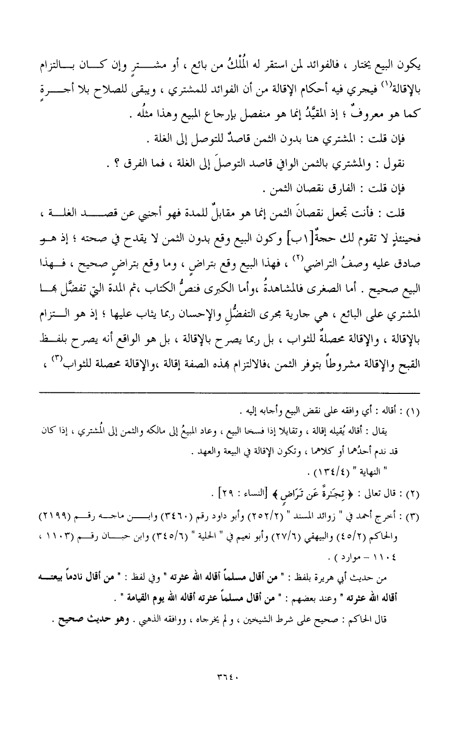 قلت: فأنت تجعل نقصان الثمن إنما هو مقابل للمدة فهو أجنبي عن قصد الغلة، فحينئذ لا تقوم لك حجة وكون المبيع وقع بدون الثمن لا يقدح في صحته؛ إذ هو صادق عليه وصف التراضي (¬2)، فهذا البيع وقع بتراض، وما وقع بتراض صحيح، فهذا البيع صحيح. أما الصغرى فالمشاهدة، وأما الكبرى فنص الكتاب، ثم المدة التي تفضل بها المشتري على البائع، هي جاريه مجري التفضل والإحسان ربما يثاب عليها؛ إذ هو التزم بالإقالة، والإقالة محصلة للثواب، بل ربما يصرح بالإقالة، بل هو الواقع أنه يصرح بلفظ القبح والإقالة مشروطا بتوفر الثمن، فالالتزام بهذه الصفة إقالة، والإقالة محصلة للثواب (¬3)،