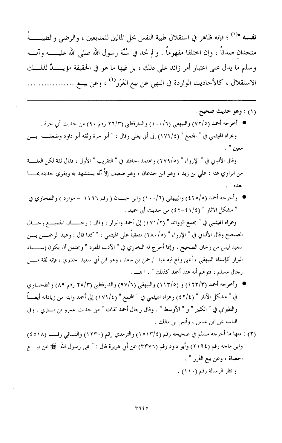 نفسه " (¬1)؛ فإنه ظاهر في استقلال طيبة النفس بحل المالين للمتابعين، والرضي والطيبة متحدان صدقا، وأن اختلف مفهوما. ولم نجد في سنة رسول الله صَلَّى اللهُ عَلَيْهِ وَآلِهِ وَسَلَّمَ ما يدل على اعتبار أمر زائد على ذلك، بل فيها ما هو في الحقيقة مؤيد لذلك الاستقلال، كالأحاديث الواردة في النهي عن بيع الغرر (¬2)، وعن بيع ...............................