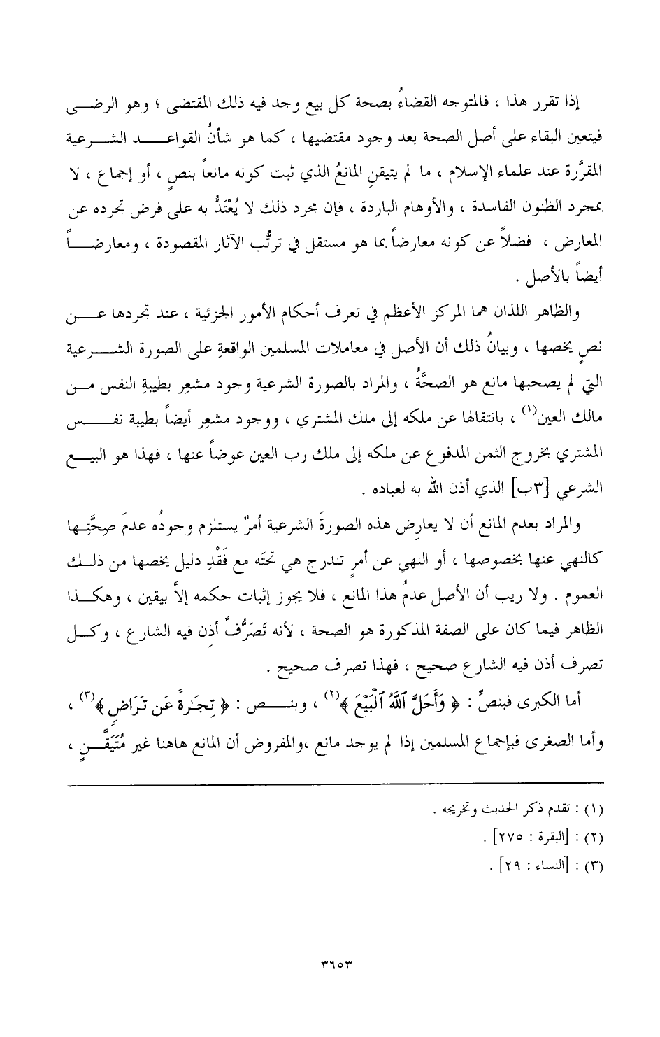 والظاهر اللذان هما المركز الأعظم في تعرف أحكام الأمور الجزئية، عند تجردها عن نص بعضها، وبيان ذلك أن الأصل في معاملات المسلمين الواقعة على الصورة الشرعية التي لم يصحبها مانع هو الصحة، والمراد بالصورة الشرعية وجود مشعر بطيبة النفس من مالك العين (¬1)، بانتقالها عن ملكه إلى المشتري، ووجود مشعر بطيبة نفس المشتري بخروج الثمن المدفوع عن ملكه إلى رب العين عوضا عنها، فهذا هو البيع الشرعى الذي أذن الله لعباده.