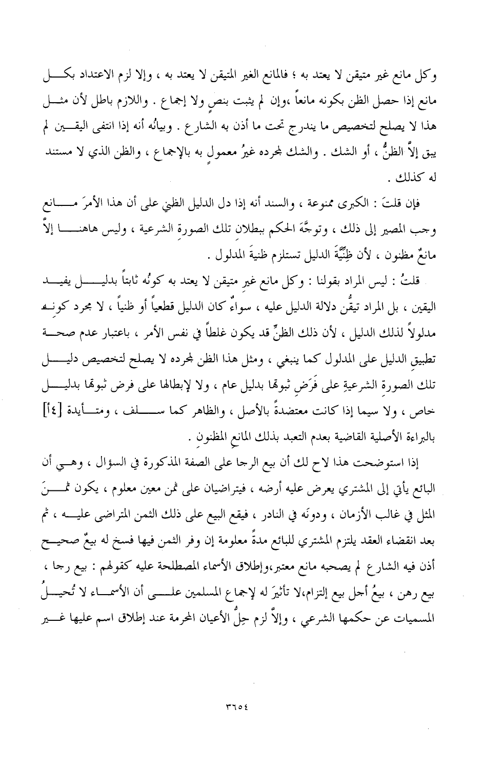 قلت: ليس المراد بقولنا: وكل مانع غير متيقن لا يعتد به كونه ثابتا بدليل يفيد اليقين، بل المراد تيقن دلالة الدليل، لأن ذلك الظن قد يكون غلطا في نفس الأمر، باعتبار عدم صحة تطبيق الدليل على المدلول كما ينبغي، ومثل هذا الظن لمجرده لا يصلح لتخصيص دليل تلك الصورة الشرعية على فرض ثبوتها بدليل عام، ولا لإبطالها على فرض ثبوتها بدليل خاص، ولا سيما إذا كانت معتضدة بالأصل، والظاهر كنا سلف، ومتأيدة بالبراءة الأصلية القاضية بعدم التعبد بذلك المانع المظنون.