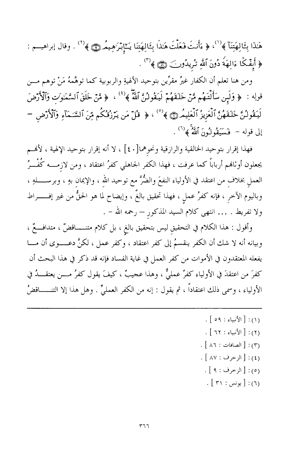 فهذا إقرار بتوحيد الخالقية والرازقية ونحوهما [40]، لا أنه إقرار بتوحيد الإلهية، لأنهم يجعلون أوثانهم أربابا كما عرفت، فهذا الكفر الجاهلي كفر اعتقاد، ومن لازمه كفر العمل بخلاف من اعتقد في الأولياء النفع والضر مع توحيد الله، والإيمان به، وبرسله، وباليوم الآخر، فإنه كفر عمل، فهذا تحقيق بالغ، وإيضاح لما هو الحق من غير إفراط ولا تفريط ... انتهى كلام السيد المذكور -رحمه الله-.