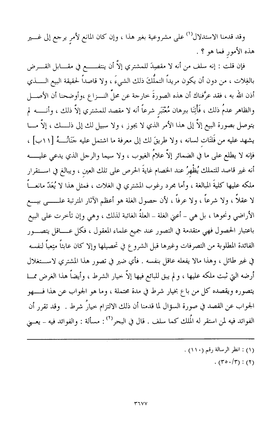 فإن قلت: إنه سلف من أنه لا مقصد للمشتري إلا أن ينتفع في مقابل القرض بالغلات، من دون أن يكون مريدا التملك ذلك الشيء، ولا قاصدا لحقيقة البيع الذي أذن الله به، فقد عرفناك أن هذه الصورة خارجة عن محل النزاع، وأوضحنا أن الأصل والظاهر عدم ذلك، فأتنا ببرهان معتبر شرعا أنه لا مقصد للمشتري إلا ذلك، وأنه لم يتوصل بصورة البيع إلا إلى هذا الأمر الذي لا يجوز، ولا سبيل لك إلى ذلك إلا ما يشهد عليه من فلتات لسانه، ولا طريق لك إلى معرفة ما اشتمل جنانه، فإنه لا يطلع على في الضمائر إلا علام الغيوب، ولا سيما الرجل الذي يدعي عليه أنه غير قاصد للتملك يظهر عند الخصام غاية الحرص على تلك العين، ويبالغ في استقرار ملكه عليها كلية المبالغة، وأما مجرد رغوب المشتري في الغلات، فمثل هذا لا يعد مانعا لا عقلا، ولا شرعا، ولا عرفا، لأن حصول الغلة هو أعظم الآثار المترتبة على بيع الأراضي ونحوها، بل هي - أعني الغلة - العلة الغائبة لذلك، وهي إن تأخرت على البيع، باعتبار الحصول فهي متقدمة في التصور عند جميع علماء المعقول، فكل عاقل يتصور الفائدة المطلوبة من التصرفات وغيرها قبل الشروع في تحصيلها وإلا كان عابثا متعبا لنفسه في غير طائل، وهذا ما لا يفعله عاقل بنفسه. فأي ضير في تصور هذا المشترى لاستغلال أرضه التي ثبت ملكه عليها، ولم يبق للبائع فيها إلا خيار الشرط، وأيضا هذا الغرض مما يتصوره ويقصده كل من باع بخيار شرط في مدة محتملة، وما هو الجواب عن هذا فهو الجواب عن القصد في صورة السؤال لما قدمنا أن ذلك الالتزام خيار شرط. وقد تقرر أن الفوائد فيه لمن استقر له الملك كما سلف. قال في البحر (¬2): مسألة: والفوائد فيه - يعني