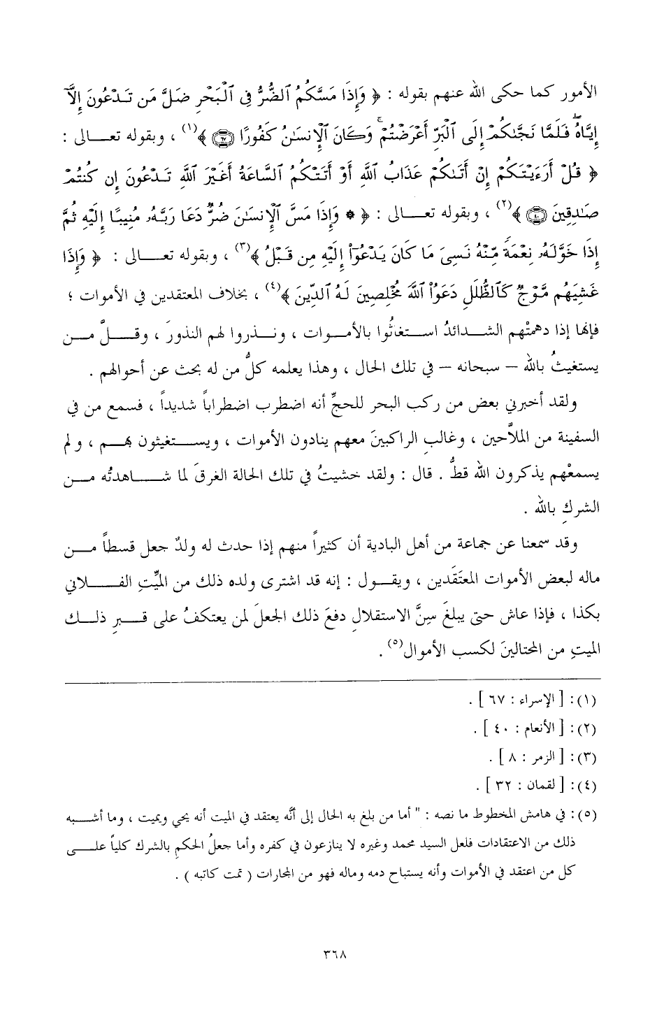 ولقد أخبرني بعض من ركب البحر للحج أنه اضطرب اضطرابا شديدا، فسمع من في السفينة من الملاحين، وغالب الراكبين معهم ينادون الأموات، ويستغيثون بهم، ولم يسمعهم يذكرون الله قط. قال: ولقد خشيت في تلك الحالة الغرق لما شاهدته من الشرك بالله.