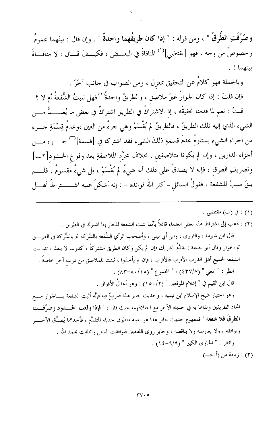 (¬2) ذهب إلى اشتراط هذا بعض العلماء قائلا بأنها تثبت الشفعة للجار إذا اشترك في الطريق.