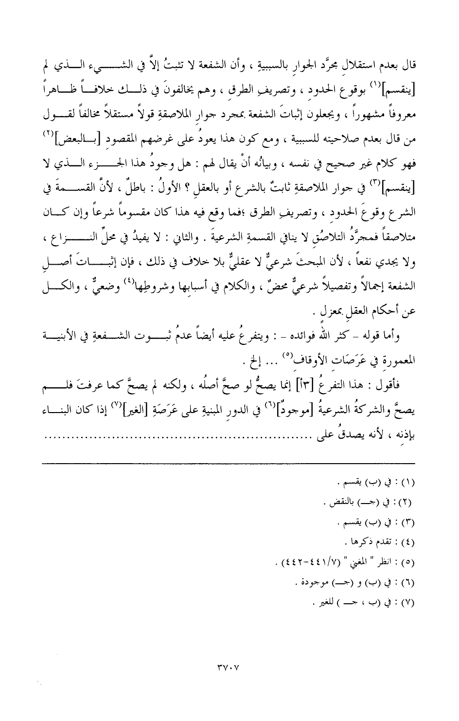 قال بعدم استقلال مجرد الجوار بالسببية، وأن الشفعة لا تثبت إلا في الشيء الذي لم [ينقسم] (¬1) بوقوع الحدود، وتصريف الطرق، وهم يخالفون في ذلك خلافا ظاهرا معروفا مشهورا، ويجعلون إثبات الشفعة بمجرد جوار الملاصقة قولا مستقلا مخالفا لقول من قال بعدم صلاحيته للسببية، ومع كونه هذا يعود على غرضهم المقصود [بالبغيض] (¬2) فهو كلام غير صحيح في نفسه، وبيانه أن يقال لهم: هل وجود هذا الجزء الذي لا [ينقسم] (¬3) في جوار الملاصقة ثابت بالشرع أو بالعقل؟ الأول: باطل لأن القسمة في الشرع وقوع الحدود، وتصريف الطرق؛ فما وقع فيه هذا كان مقسوما شرعا وإن كان متلاصقا فمجرد التلاصق لا ينافي القسمة الشرعية. والثاني: لا يفيد في محل النزاع، ولا يجدي نفعا، لأن المبحث الشرعي لا عقلي بلا خوف في ذلك، فإن إثبات أصل الشفعة إجمالا وتفصيلا شرعي محض، والكلام في أسبابها وشروطها (¬4) وضعي، والكل عن أحكام العقل بمعزل.
