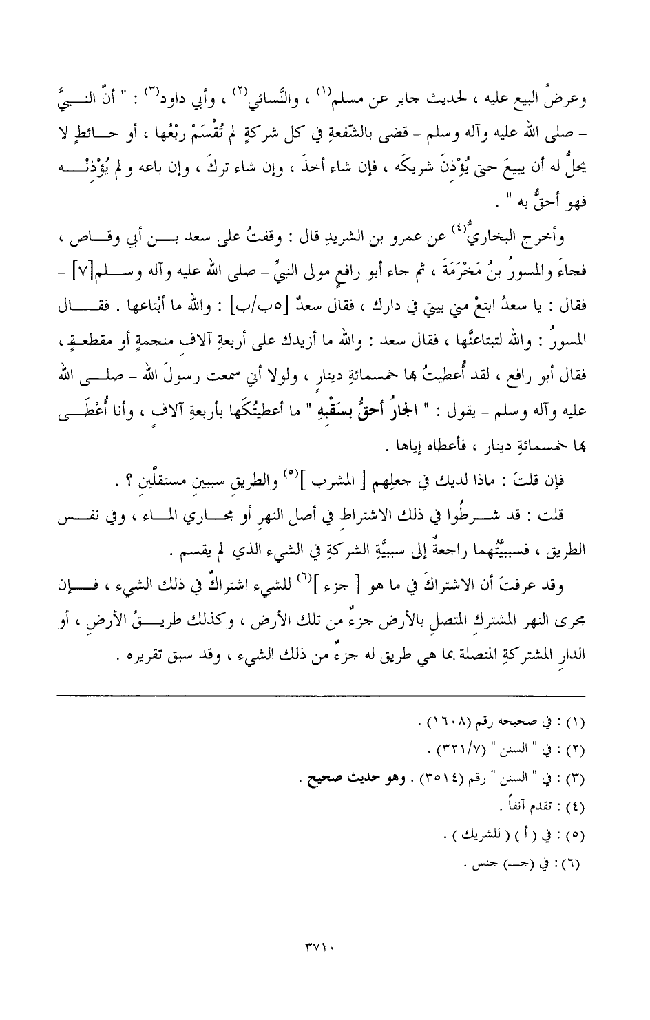 وأخرج البخاري (¬4) عن عمرو بن الشريد قال: وقفت على سعد بن أبي وقاص، فجاء والمسور بن مخرمة، ثم جاء أبو رافع مولى النبي - صَلَّى اللهُ عَلَيْهِ وَآلِهِ وَسَلَّمَ - فقال: يا سعد ابتع مني بيتي في دارك، فقال سعد: والله ما أبتعها. فقال المسور: والله لتبتاعها، فقال سعد والله ما أزيدك على أربعة آلاف منجمة أو مقطعة، فقال أبو رافع لقد أعطيت بها خمسمائة دينار، ولولا أني سمعت رسول الله - صَلَّى اللهُ عَلَيْهِ وَآلِهِ وَسَلَّمَ - يقول: " الجار أحق بسبقه " ما أعطيتكها بأربعة آلاف، وأنا أعطي بها بخمسمائة دينار، فأعطاها إياها.