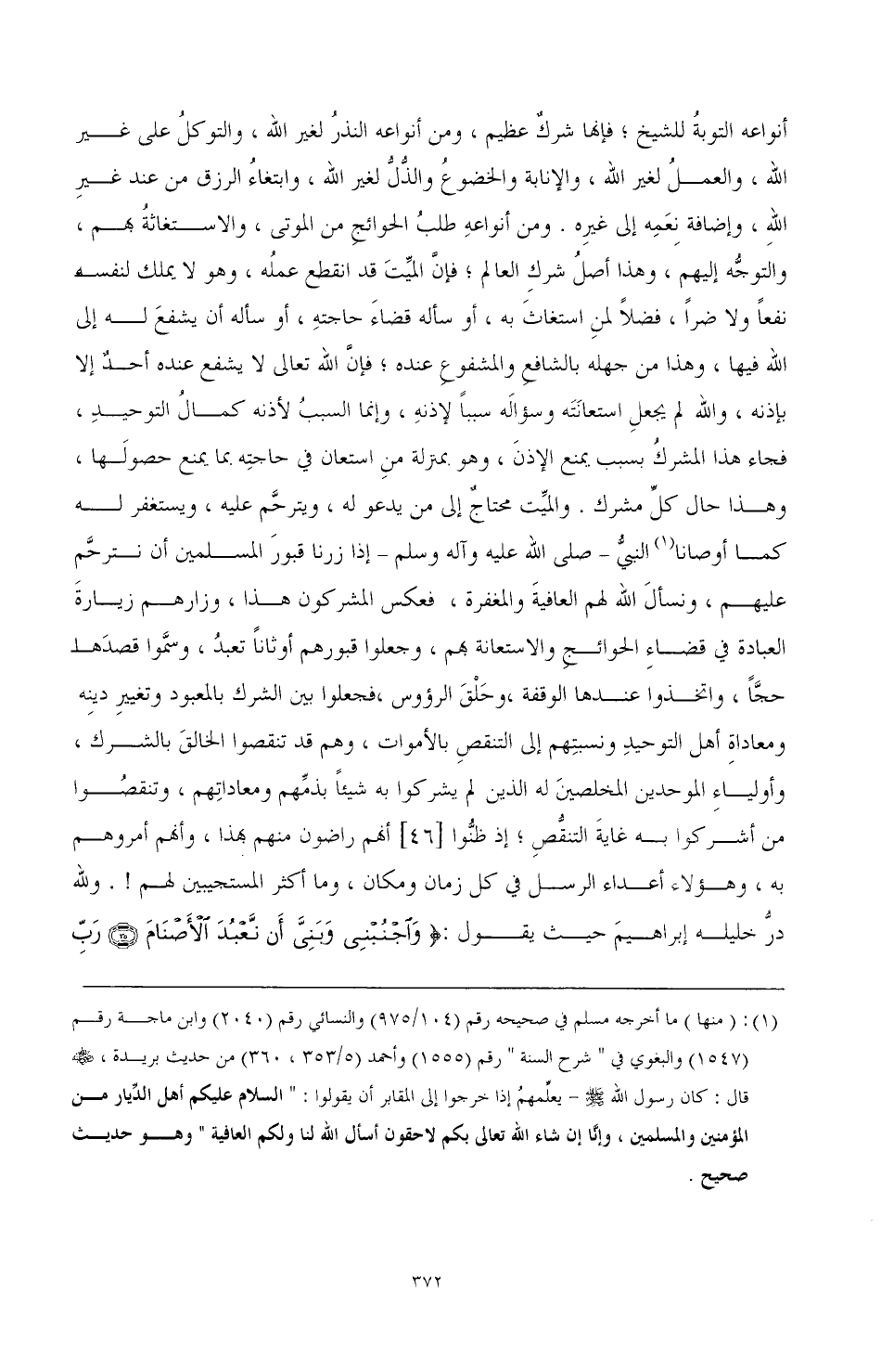 أنواعه التوبة للشيخ، فإنها شرك عظيم، ومن أنواعه النذر لغير الله، والتوكل على غير الله، والعمل لغير الله، والإنابة والخضوع والذل لغير الله، وابتغاء الرزق من عند غير الله، وإضافة نعمه إلى غيره. ومن أنواعه طلب الحوائج من الموتى، والاستغاثة بهم، والتوجه إليهم، وهذا أصل شرك العالم، فإن الميت قد انقطع عمله، وهو لا يملك لنفسه نفعا ولا ضرا، فضلا لمن استغاث به، أو سأله قضاء حاجته، أو سأله أن يشفع له إلى الله فيها، وهذا من جهله بالشافع والمشفوع عنده، فإن الله تعالى لا يشفع عنده أحد إلا بإذنه، والله لم يجعل استعانته وسؤاله سببا لإذنه، وإنما السبب لإذنه كمال التوحيد، فجاء هذا المشرك بسبب يمنع الإذن، وهو بمنزلة من استعان في حاجته بما يمنع حصولها، وهذا حال كل مشرك. والميت محتاج إلى من يدعو له، ويترحم عليه، ويستغفر له كما أوصانا (¬1) النبي -صَلَّى اللهُ عَلَيْهِ وَآلِهِ وَسَلَّمَ- إذا زرنا قبور المسلمين أن نترحم عليهم، ونسأل الله لهم العافية والمغفرة، فعكس المشركون هذا، وزارهم زيارة العبادة في قضاء الحوائج والاستعانة بهم، وجعلوا قبورهم أوثانا تعبد، وسموا قصدها حجا، واتخذوا عندها الوقفة، وحلق الرءوس، فجعلوا بين الشرك بالمعبود وتغيير دينه ومعاداة أهل التوحيد ونسبتهم إلى التنقص بالأموات، وهم قد تنقصوا الخالق بالشرك، وأولياء الموحدين المخلصين له الذين لم يشركوا به شيئا بذمهم ومعاداتهم، وتنقصوا من أشركوا به غاية التنقص؛ إذ ظنوا [46] أنهم راضون منهم بهذا، وأنهم أمروهم به، وهؤلاء أعداء الرسل في كل زمان ومكان، وما أكثر المستجيبين لهم. ولله در خليله إبراهيم حيث يقول:} واجنبني وبني أن نعبد الأصنام رب إنهن أضللن كثيرا من الناس {(¬2)