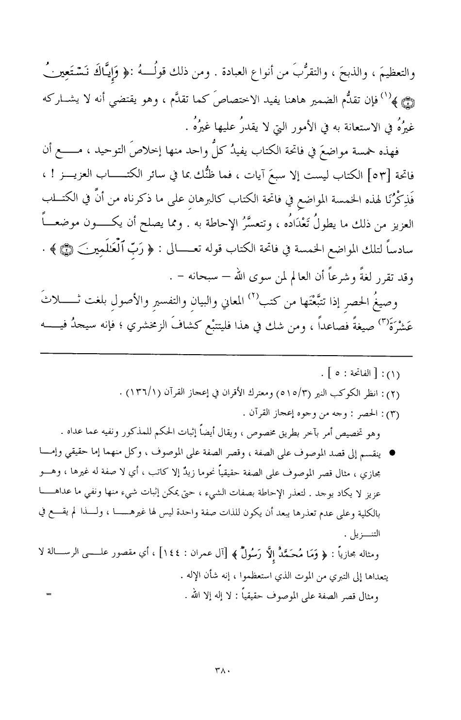 وصيغ الحصر إذا تتبعتها من كتب (¬2) المعاني والبيان والتفسير والأصول بلغت ثلاث عشرة (¬3) صيغة فصاعدا، ومن شك في هذا فليتتبع كشاف الزمخشري، فإنه سيجد فيه